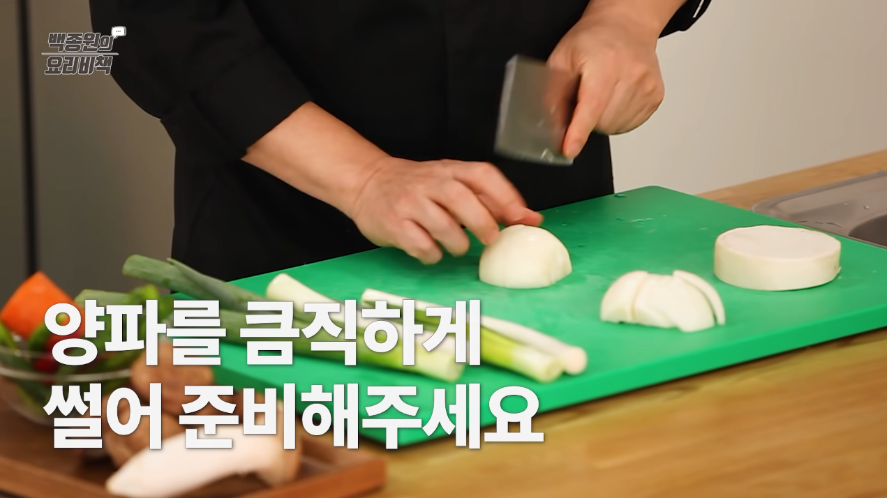 양파는 큼지막하게 깍둑썰기하고, 대파는 길이 5cm로 썬다.