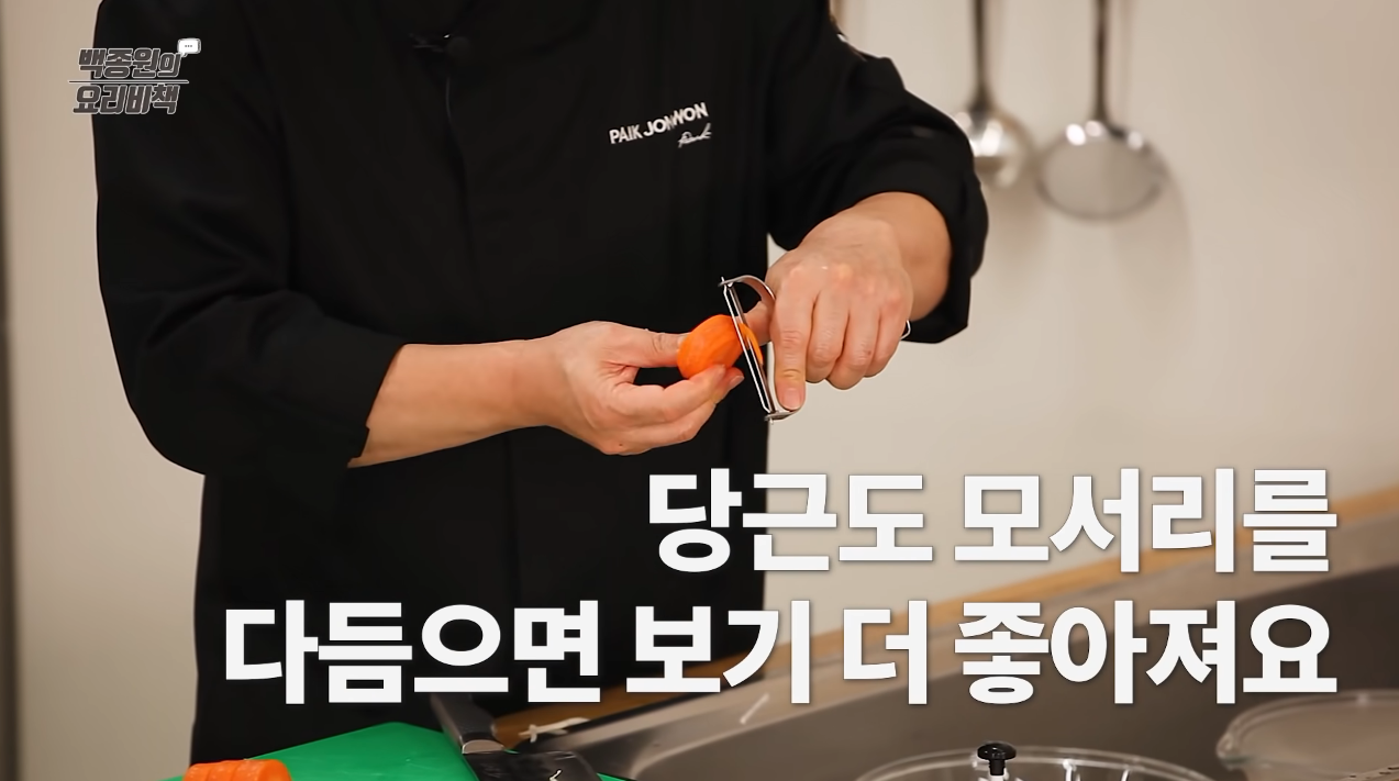 당근은 1.5cm 두께로 썬 뒤 칼이나 감자칼을 이용하여 모서리를 둥글게 깎는다.