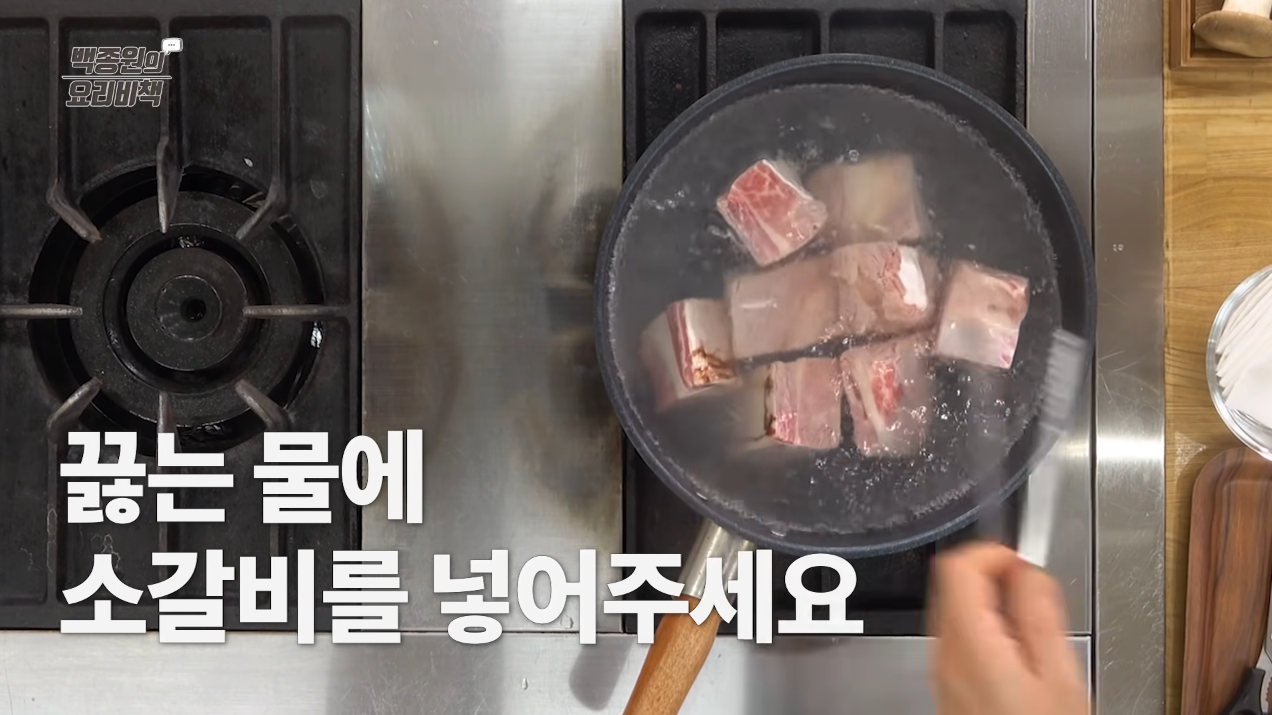 냄비에 소갈비가 잠길 정도의 물을 붓고 물이 끓어오르면 소갈비를 넣어 약 5~7분 정도 익힌다.