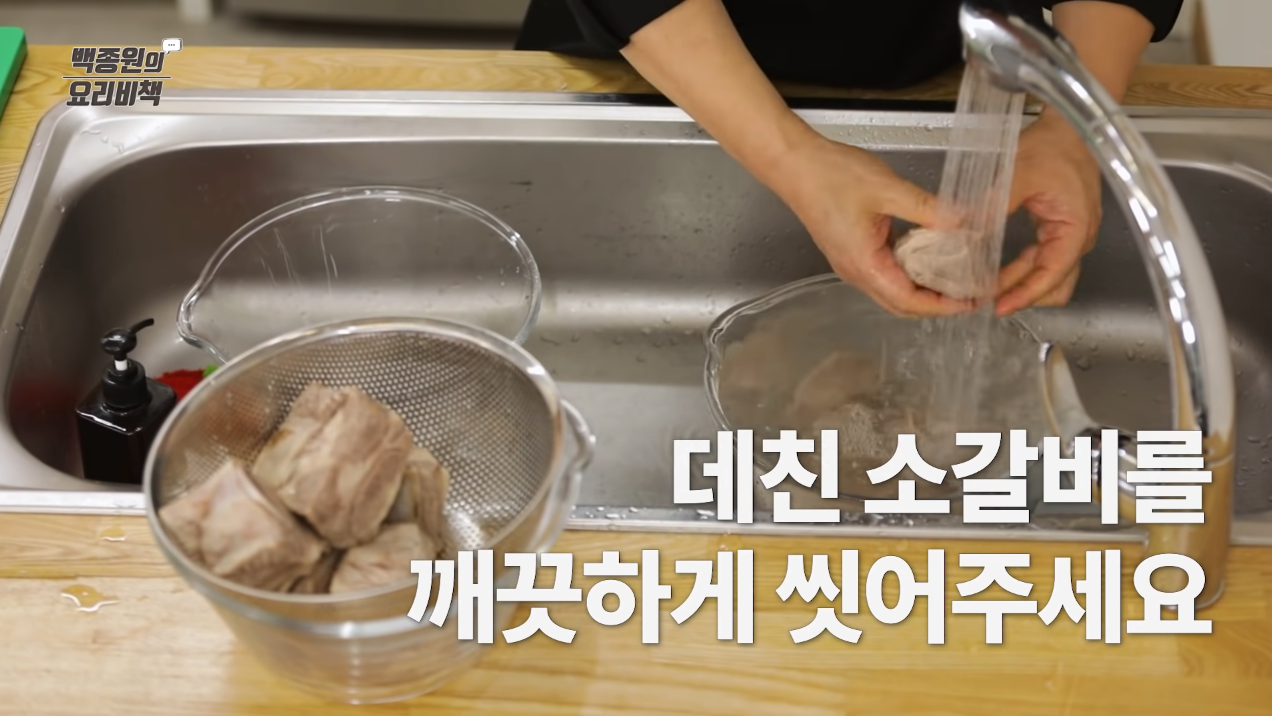 데친 소갈비는 흐르는 물에 씻어 불순물을 제거하고 체에 밭쳐 준비한다.
