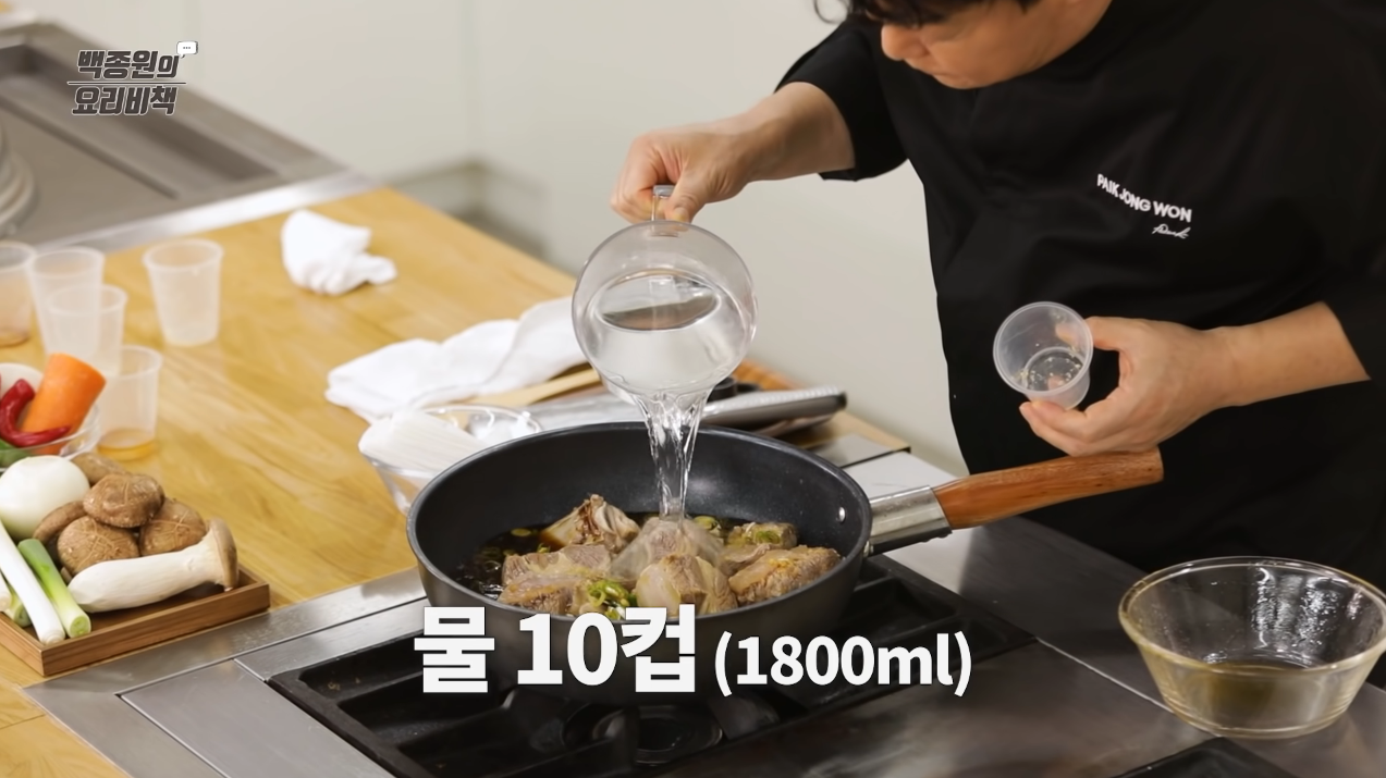 냄비에 데친 소갈비, 갈비찜 양념을 넣고 물을 붓는다.