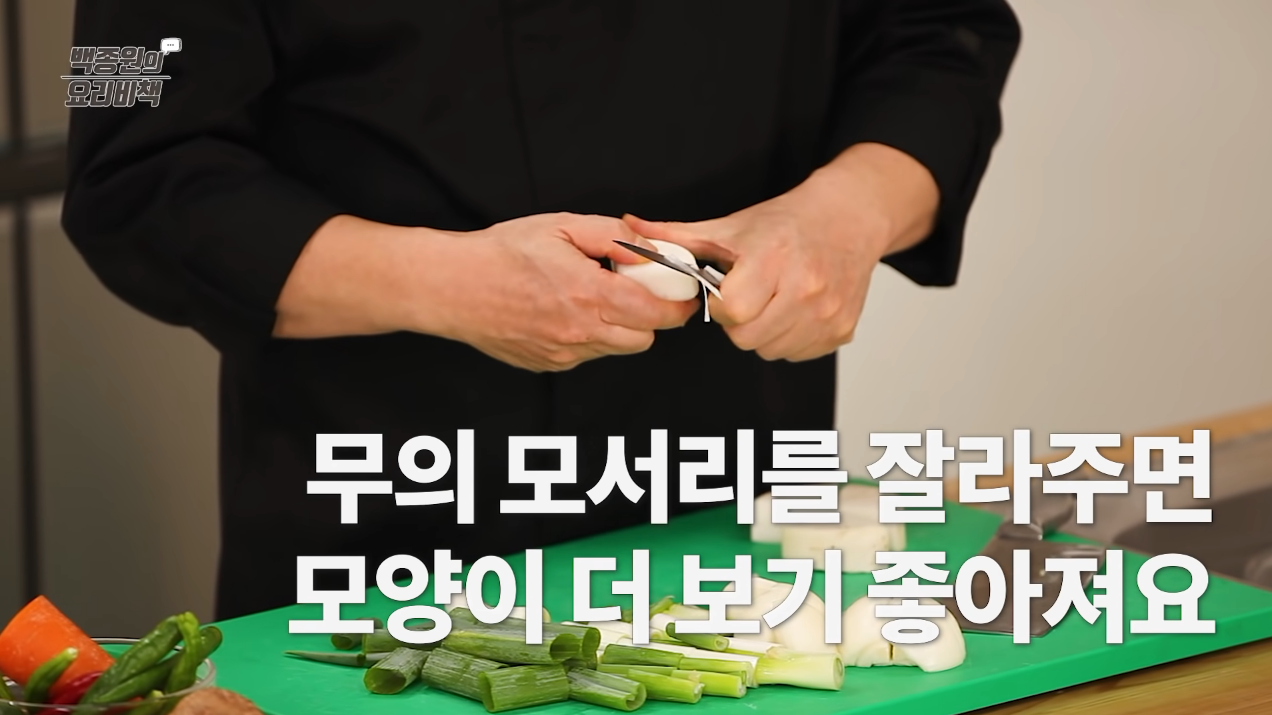 무는 1.5cm 두께로 썬 뒤 4등분하고 칼이나 감자칼을 이용하여 모서리를 둥글게 깎는다.