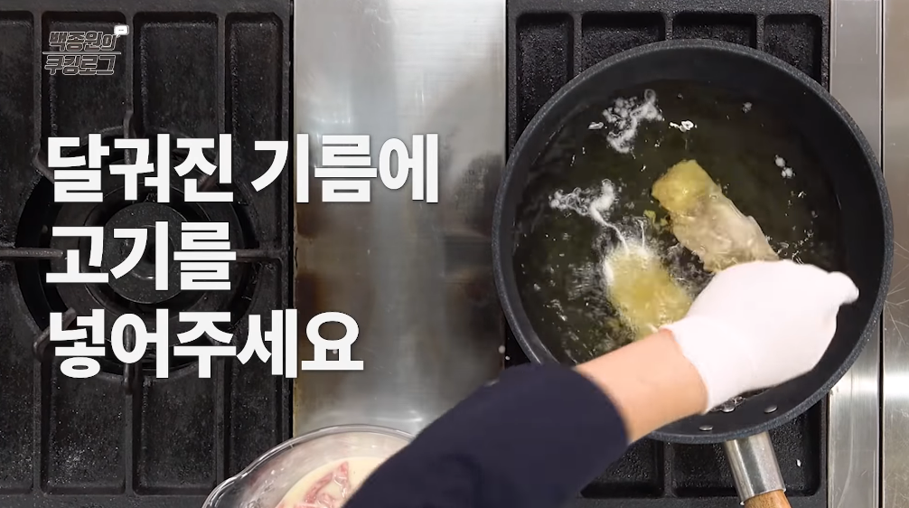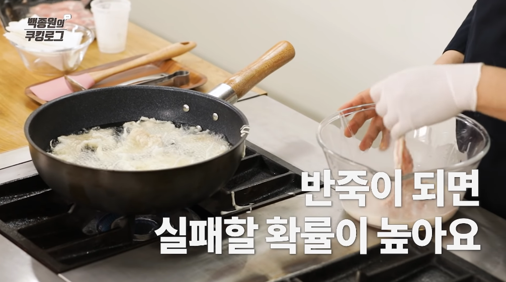 기름을 170도 정도로 예열하고 돈등심에 반죽을 입힌다.