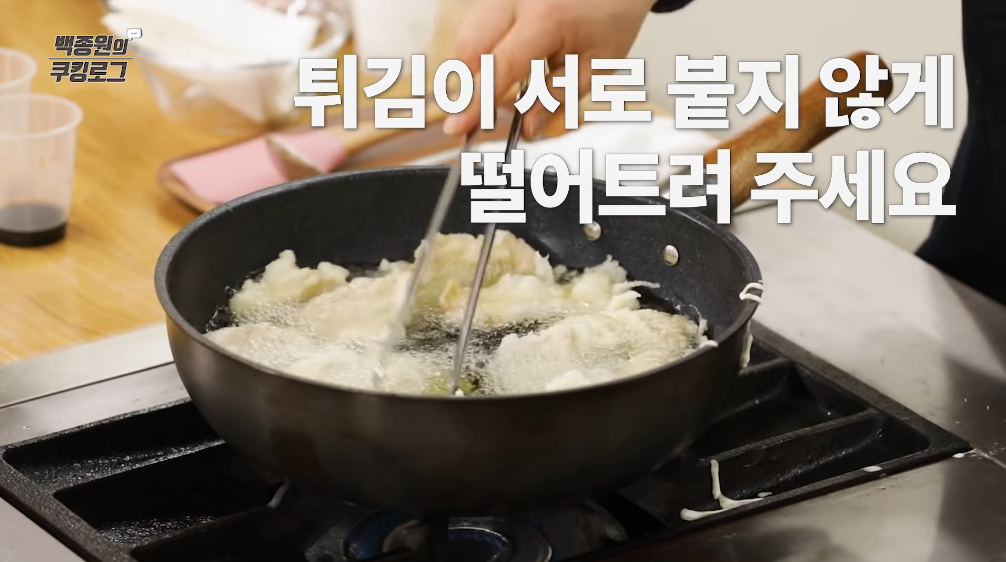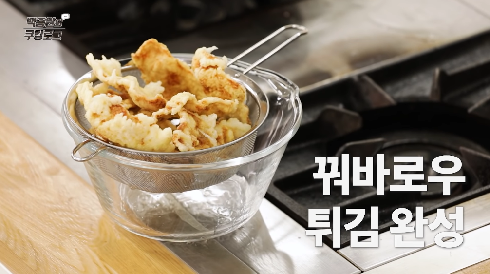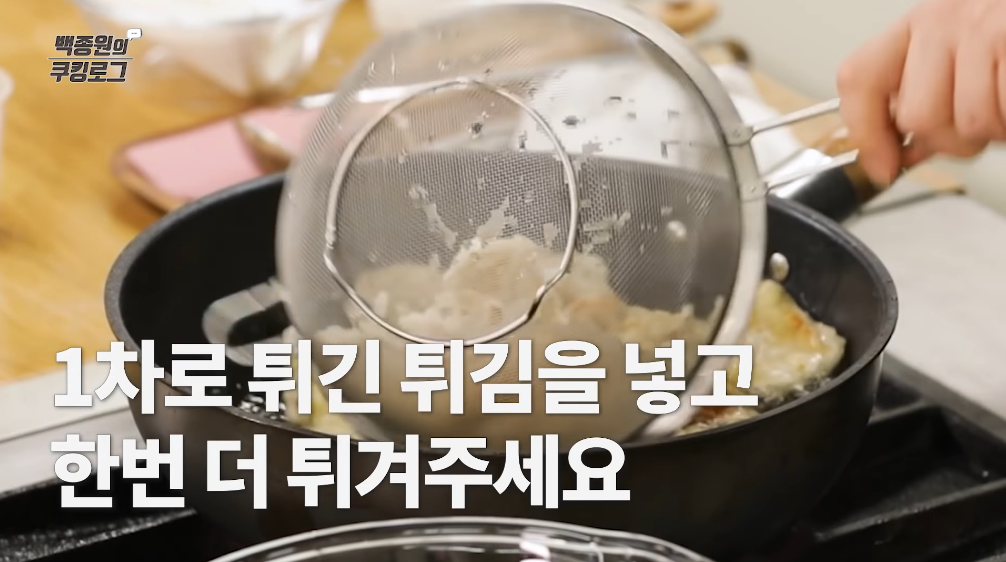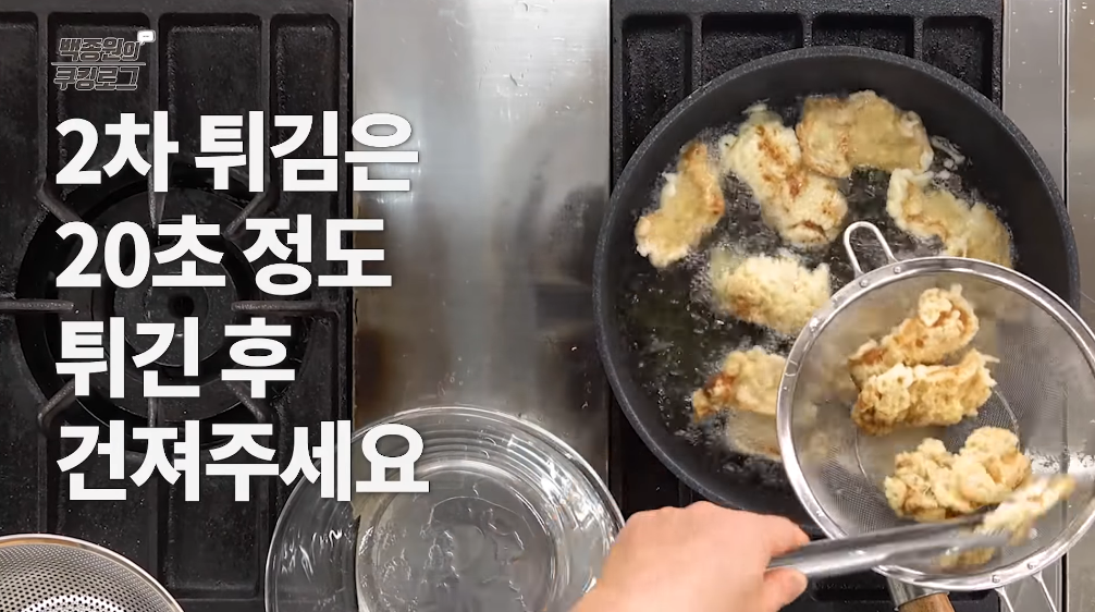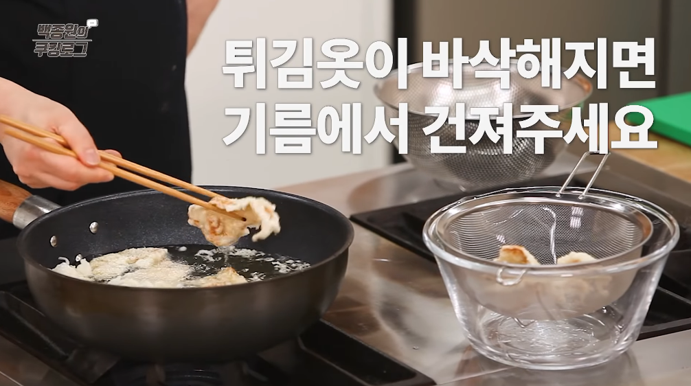 예열된 기름에 넣어 2차 튀김 해준 후 기름을 뺀다.