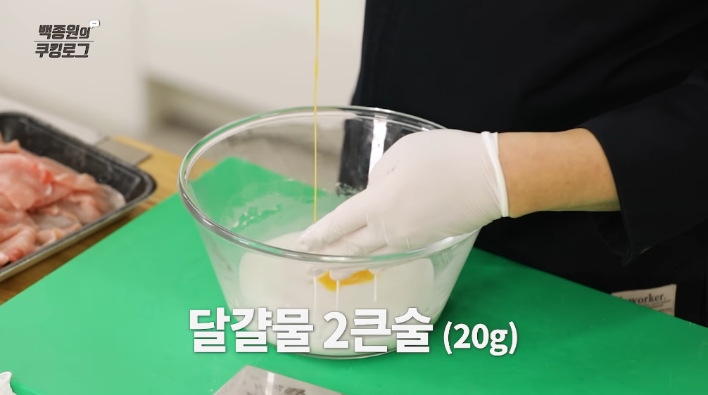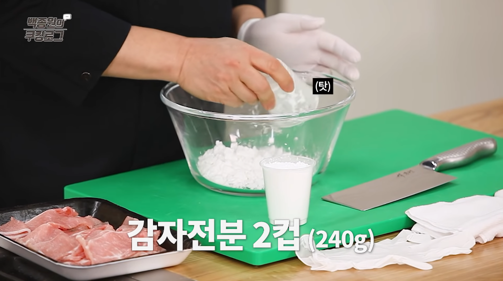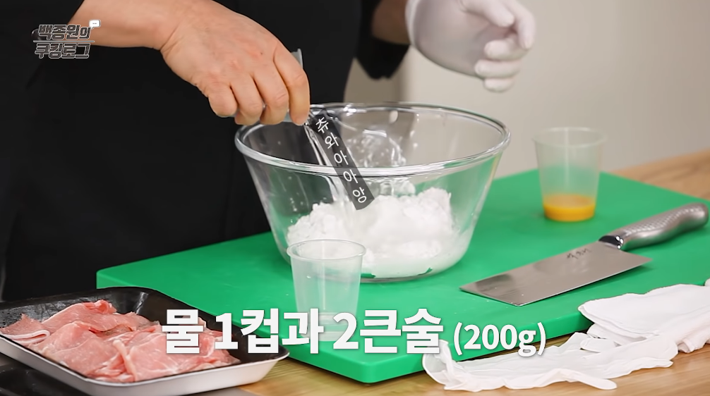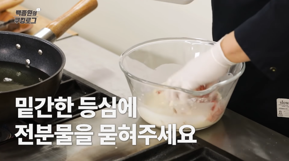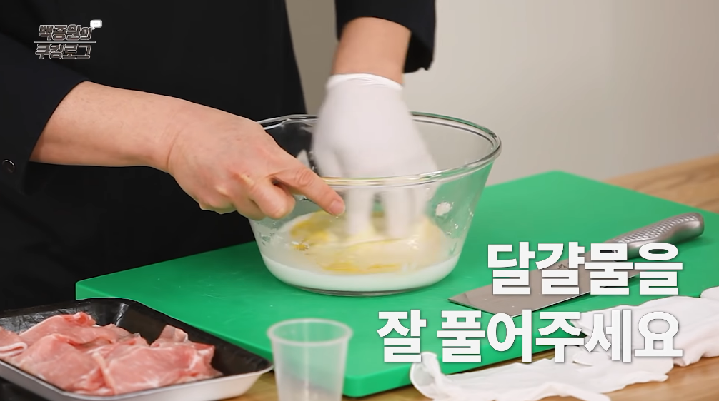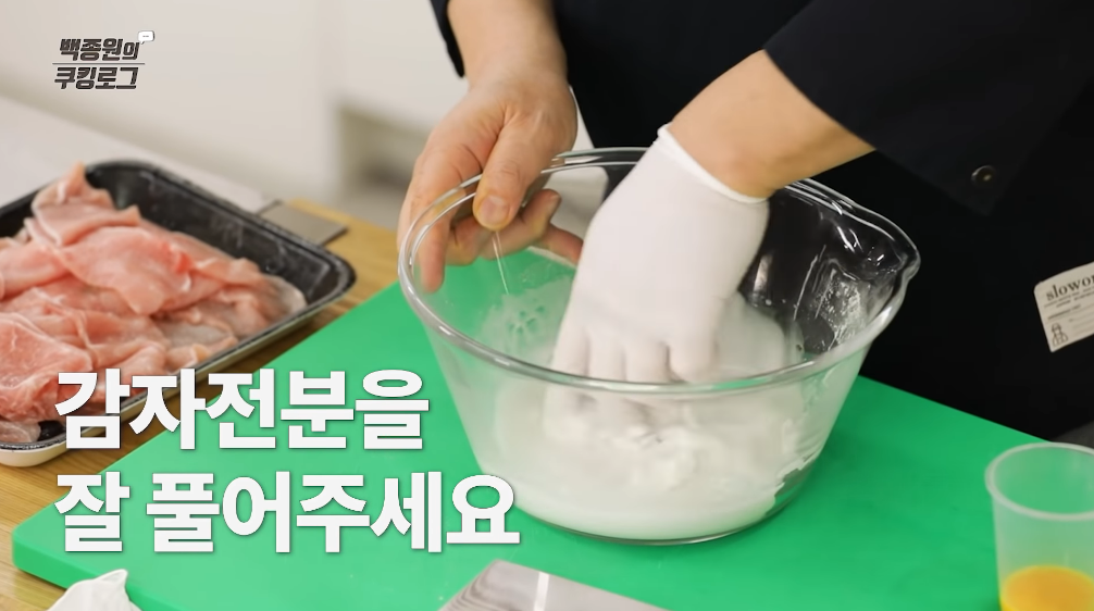 감자전분, 달걀물, 물을 섞어 튀김반죽을 만든다.