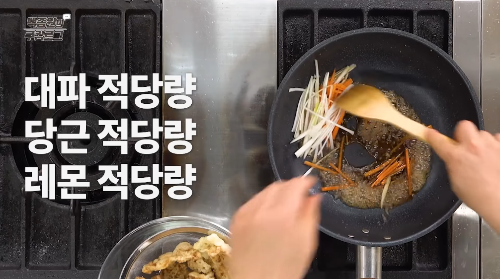 소스가 끓으면 레몬, 당근, 대파, 식초를 넣고 소스를 졸인다.