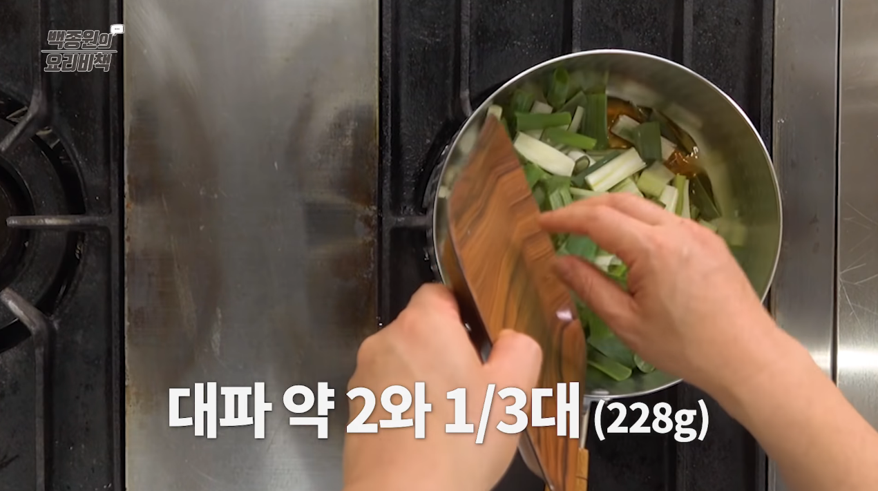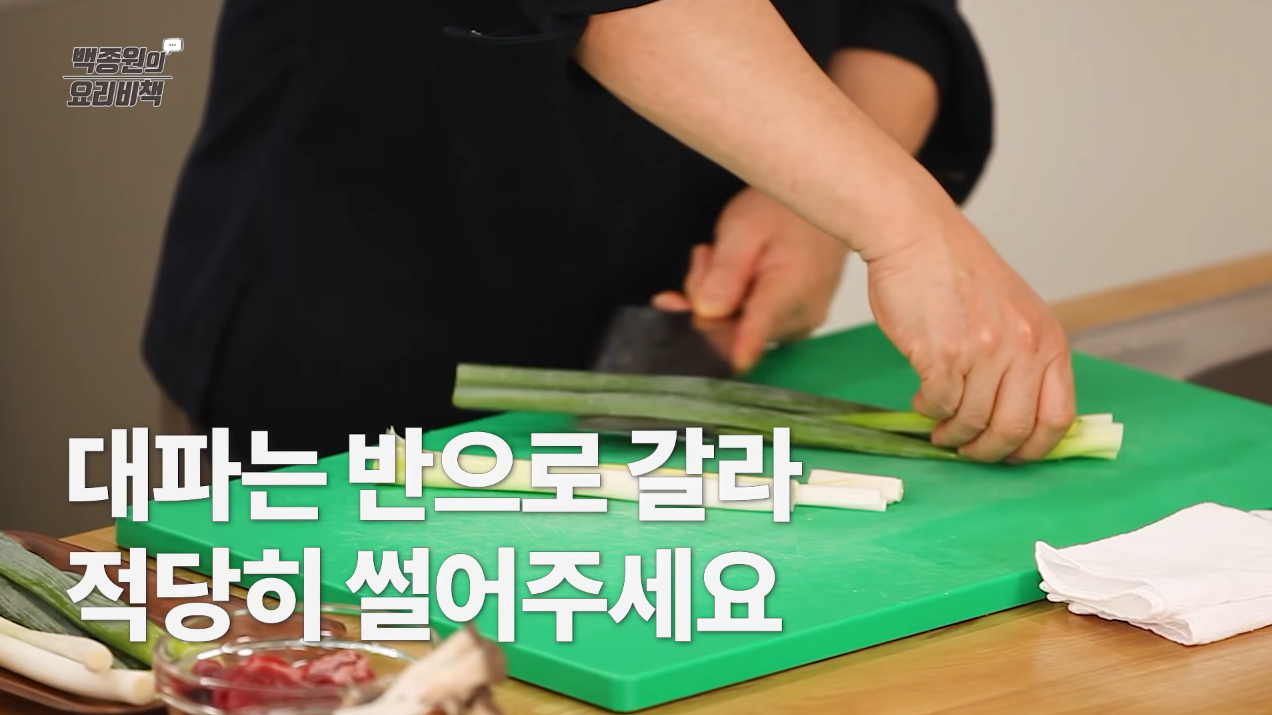 대파 2대는 길게 반 갈라 길이 5cm로 썰고 1/3대는 두께 0.3cm로 송송 썬다.