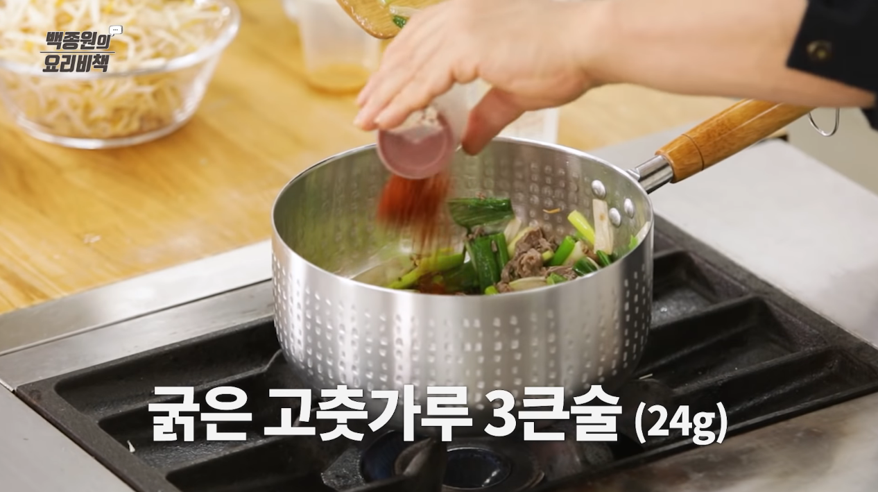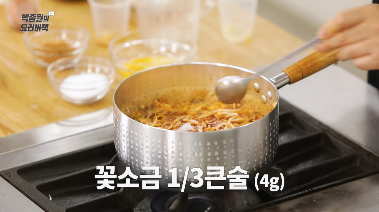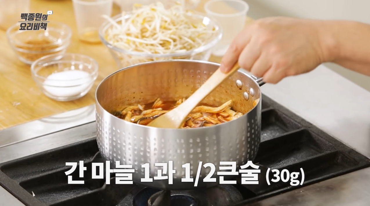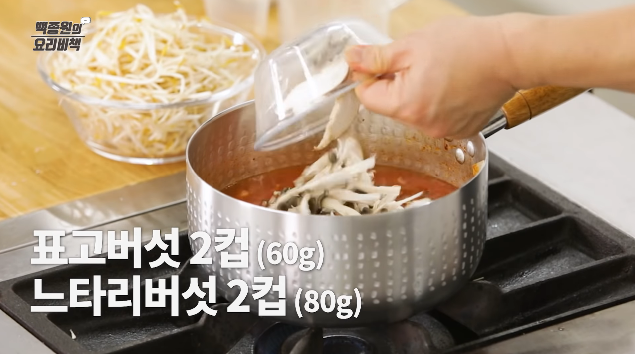 국물이 끓어오르면 숙주를 넣고 팔팔 끓으면 간을 본 후 기호에 맞게 꽃소금을 넣어 간을 맞춘다.