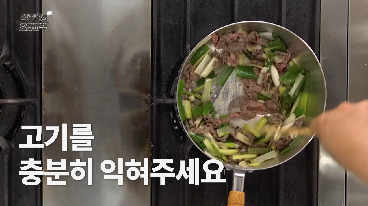 대파가 반 정도 숨이 죽으면 소고기를 넣고 핏기가 없어질 때까지 볶는다