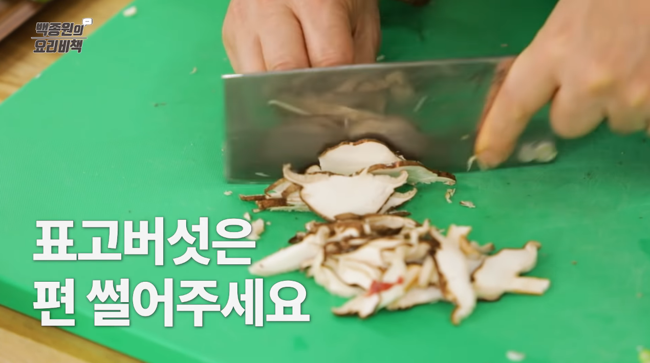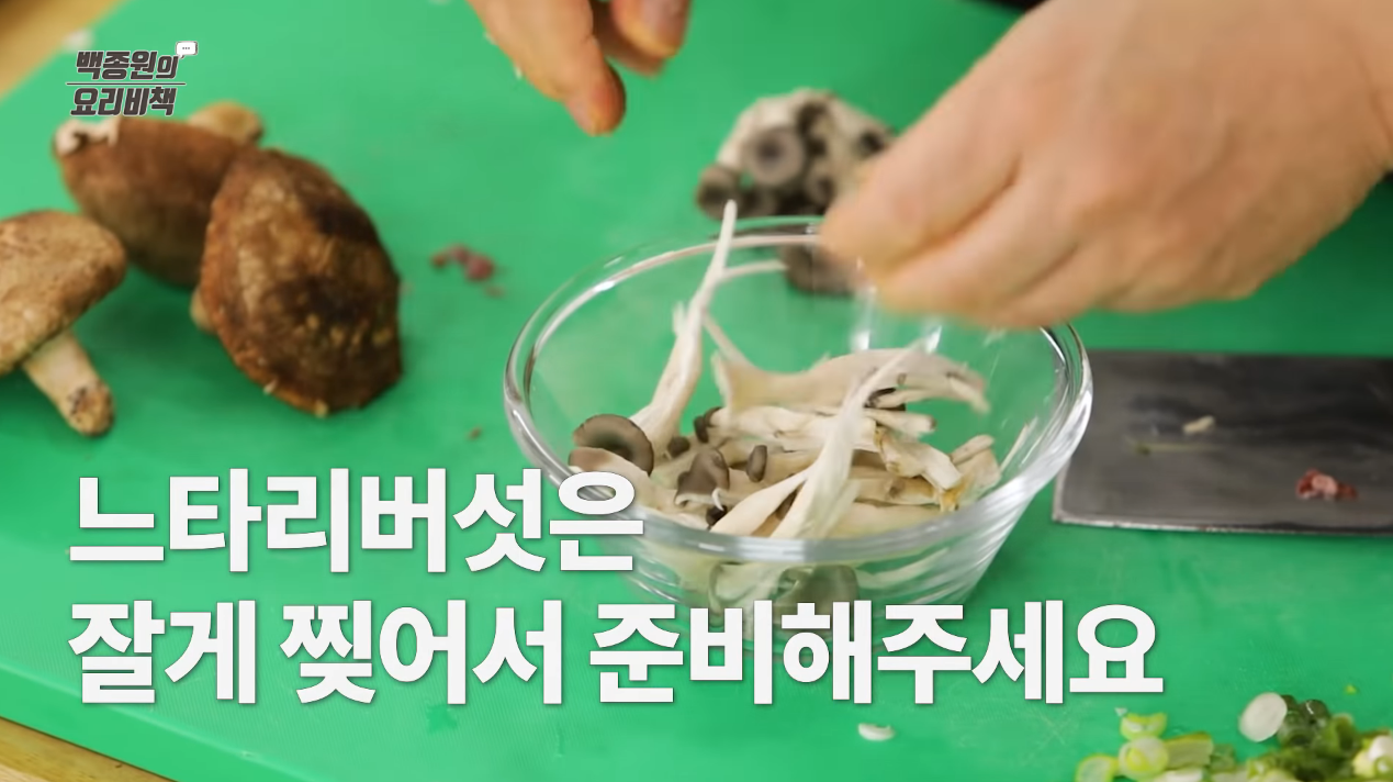 표고버섯은 심을 제거한 후 두께 0.4cm로 편 썰고, 느타리버섯은 잘게 찢어 준비한다.