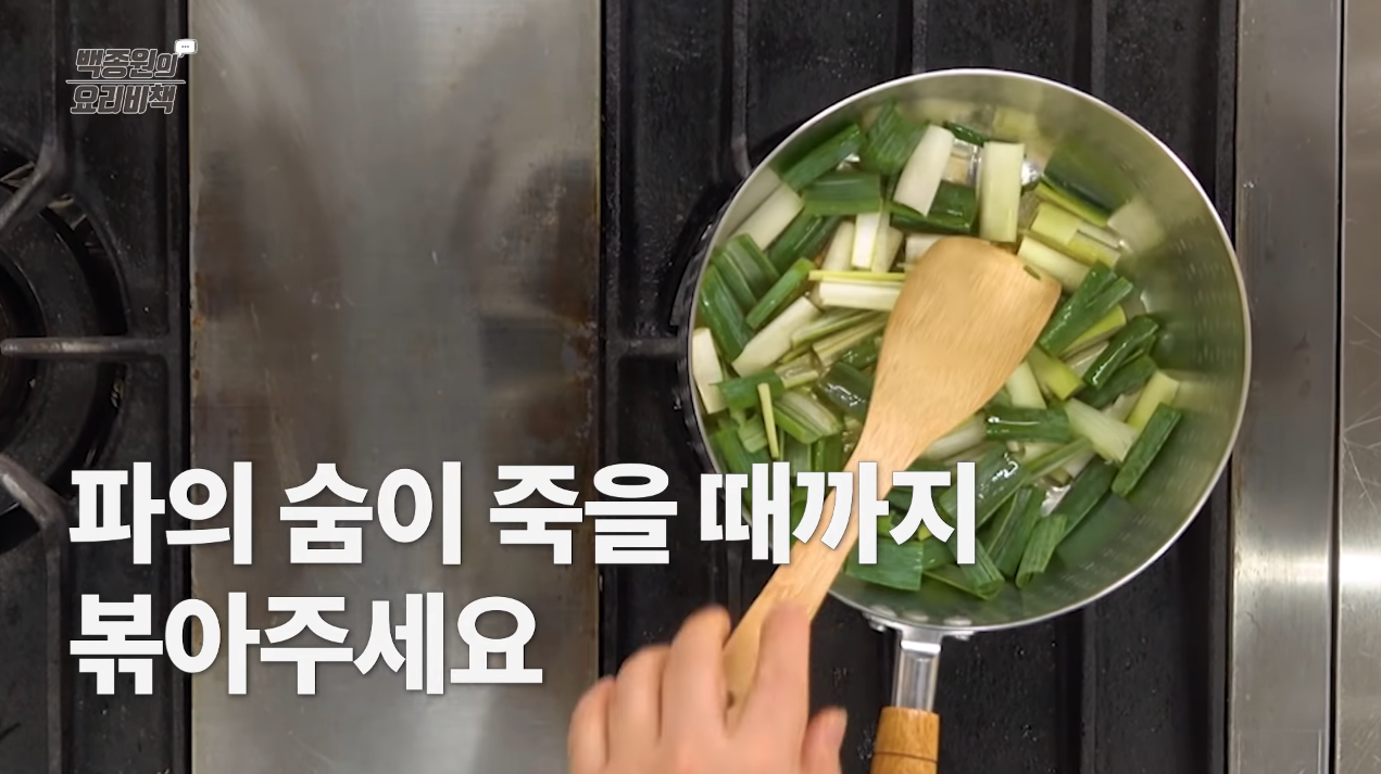 냄비에 참기름과 식용유를 넣고 길게 썬 대파를 넣어 강 불에 볶는다.