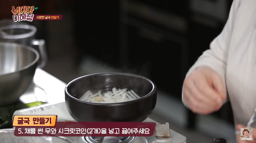 채를 썬 무와 시크릿코인(2개)을 넣고 끓여주세요
