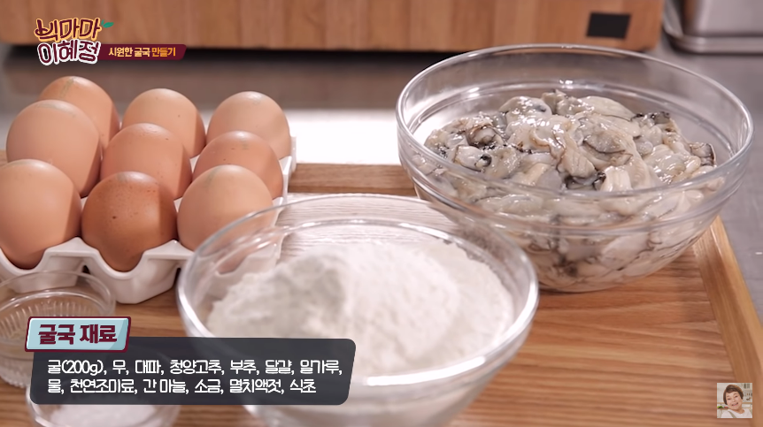 굴(200g), 무, 대파, 청양고추, 부추, 달걀, 밀가루, 물, 천연조미료, 간 마늘, 소금, 멸치액젓, 식초