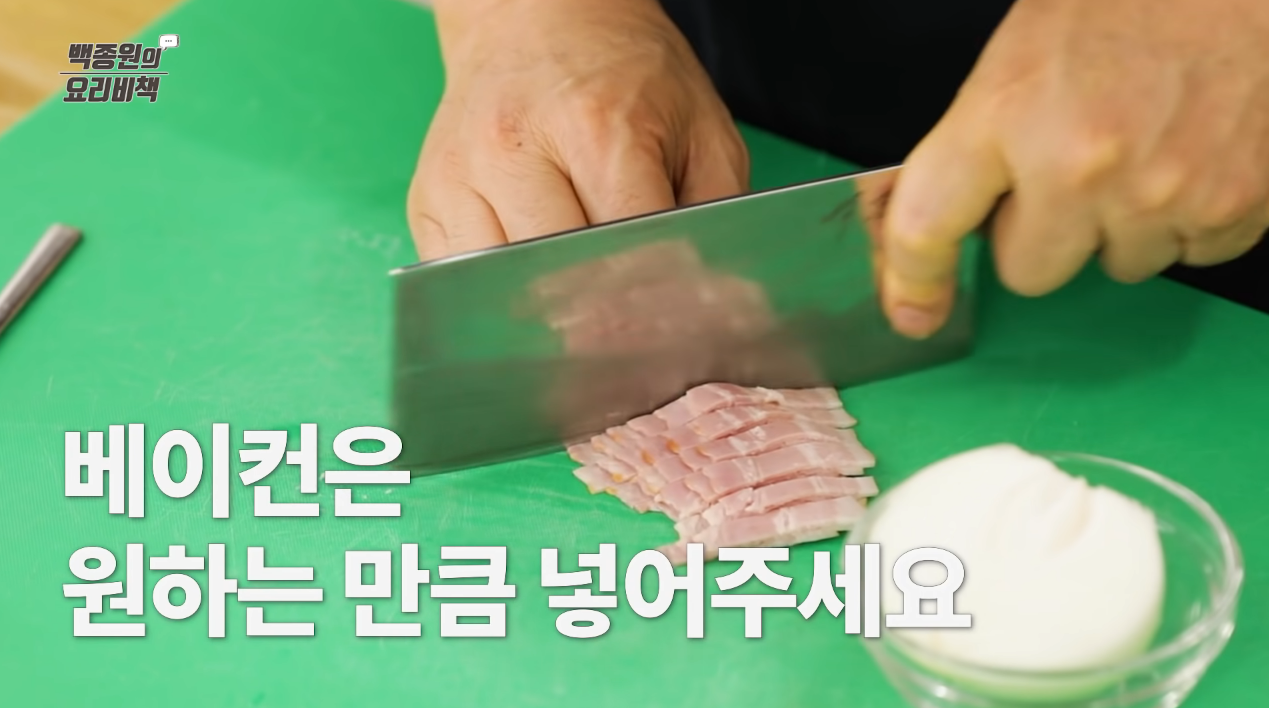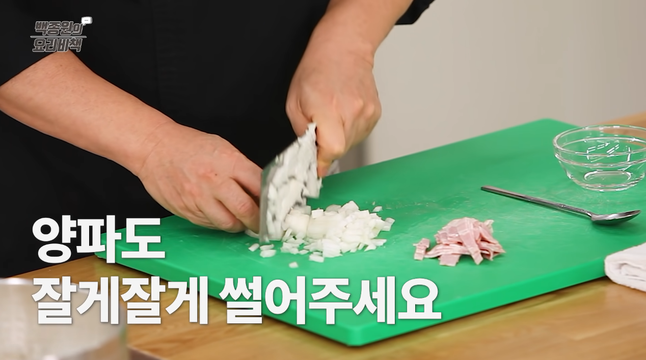 베이컨은 두께 1cm 정도로 자르고, 양파는 가로, 세로 0.5cm 정도로 다져 준비한다.