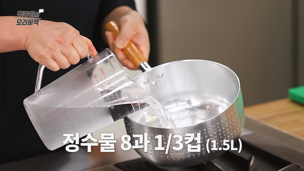 냄비에 정수물, 꽃소금, 올리브유를 넣고 스파게티면 삶을 물을 끓인다.