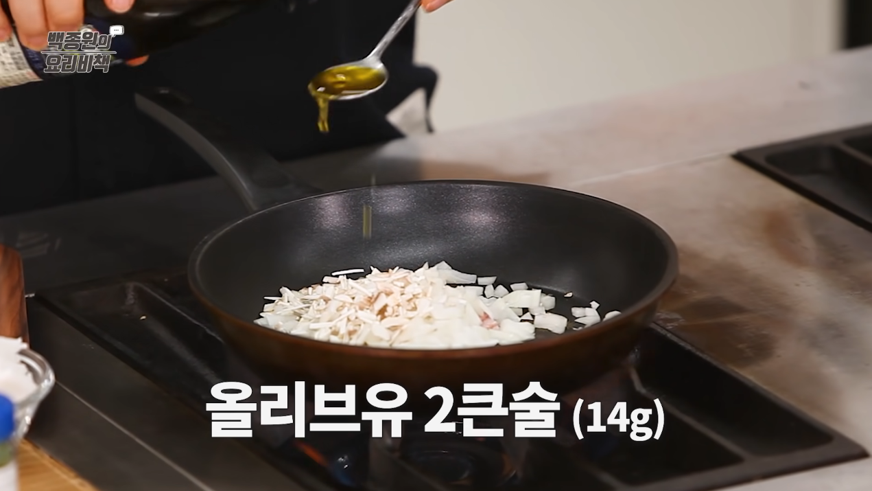 프라이팬에 베이컨, 다진양파, 다진 양송이 버섯, 올리브유를 넣고 중 불에 볶는다.