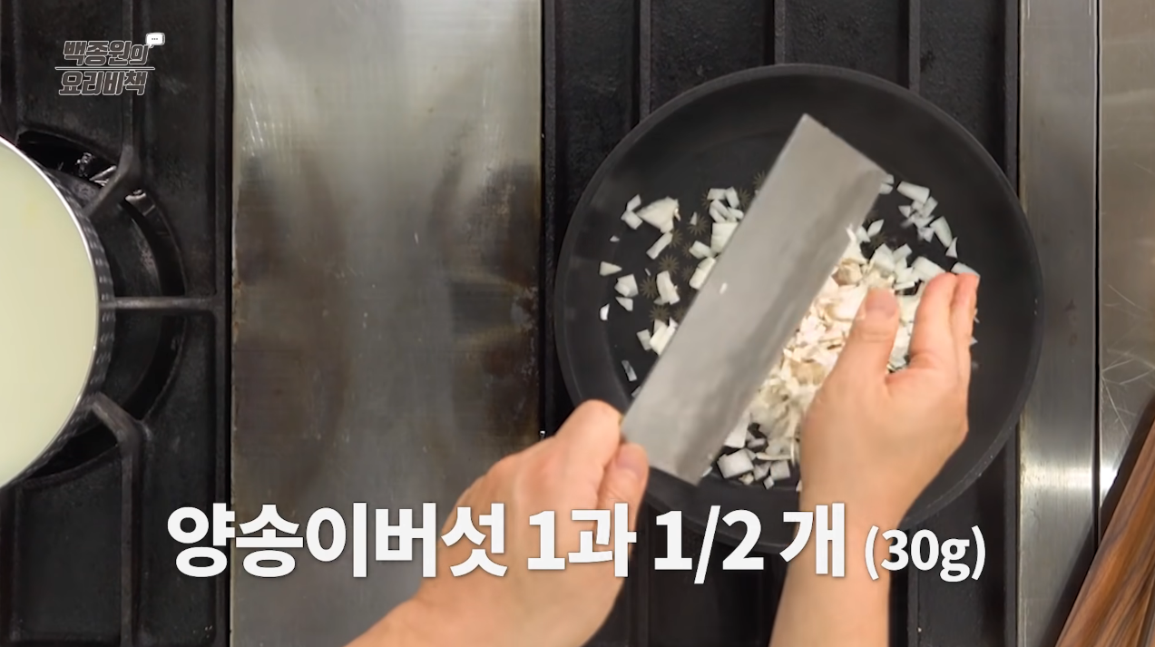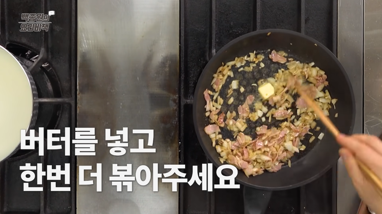 양파에 색이 나면 버터를 넣어 볶고, 버터가 녹으면 우유, 편 썰은 양송이 버섯, 스파게티 면을 넣어 졸인다.