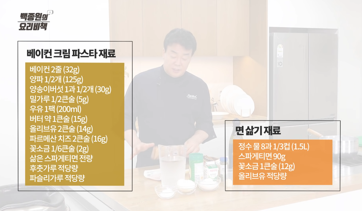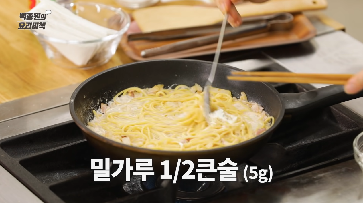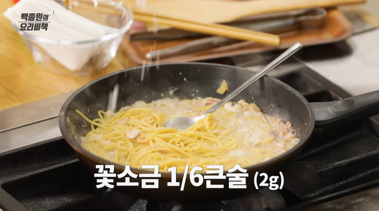 Tip: 크림파스타 농도 조절을 위해 면수는 버리지 않고 따로 보관해둔다.