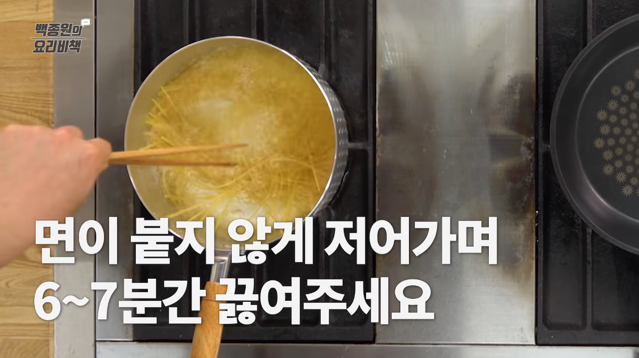 물이 끓어오르면 면을 돌려서 펼쳐 넣고 붙지않도록 저어주면서 약 6분 정도 삶아 준비한다.