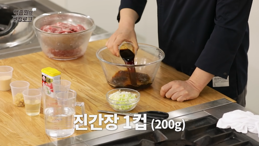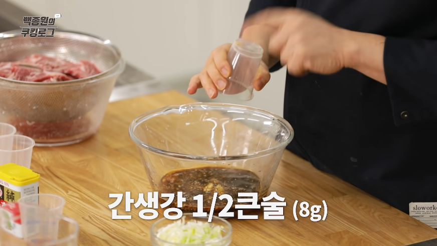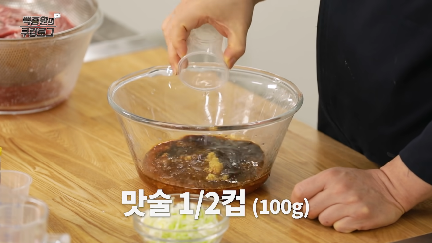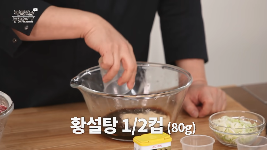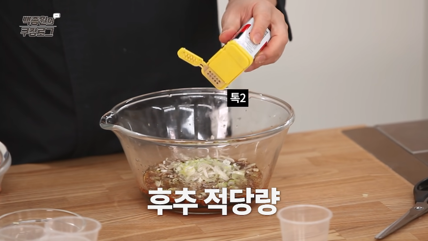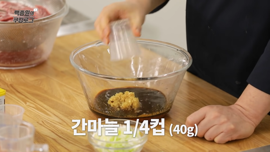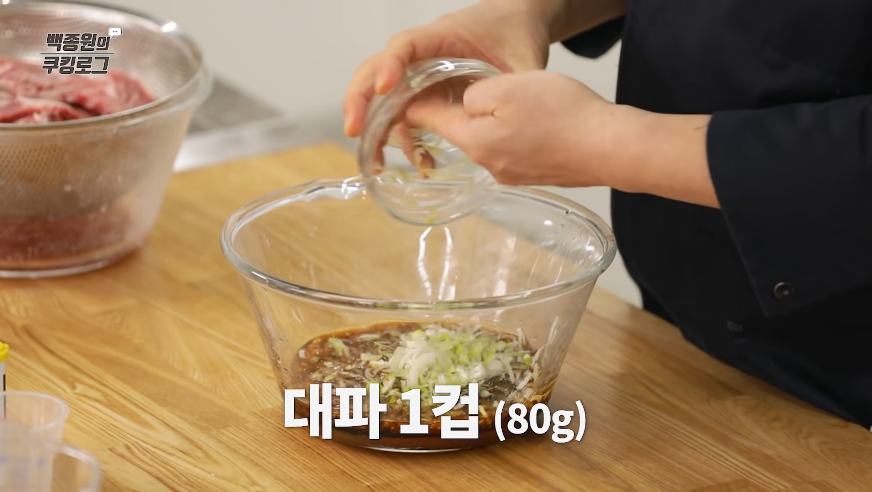 큰 볼에 진간장, 황설탕, 맛술, 간마늘, 간생강, 대파, 정수물을 넣어 양념장을 만든다.