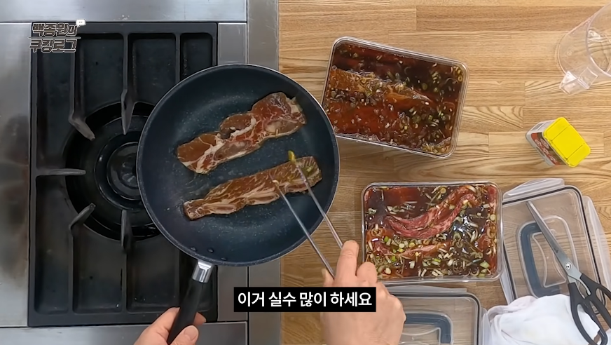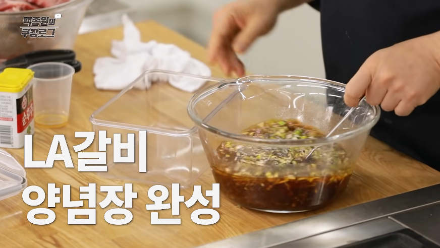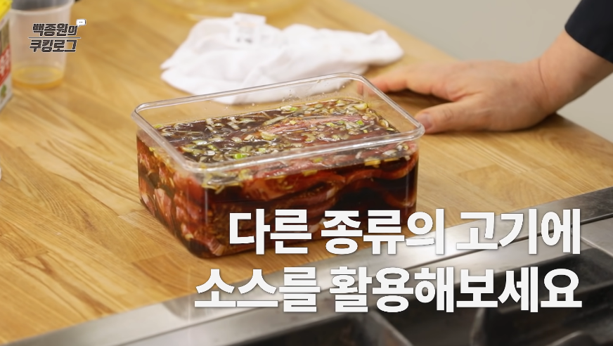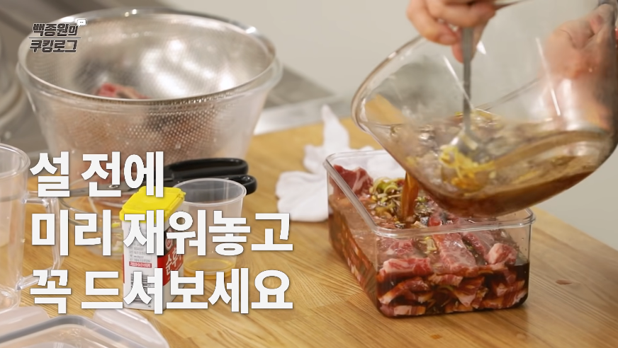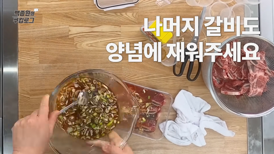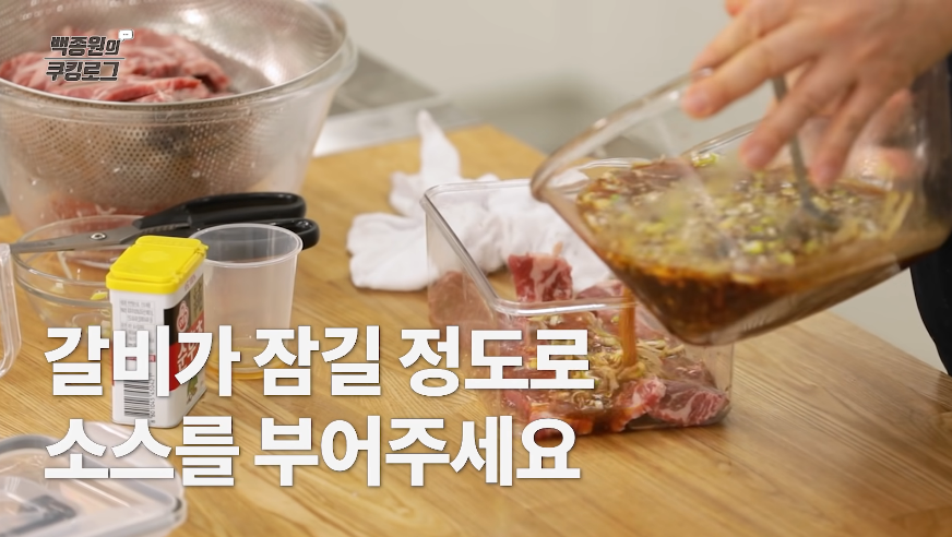 밀폐 통에 갈비를 한 장씩 깔아주고 양념장을 부어준다.