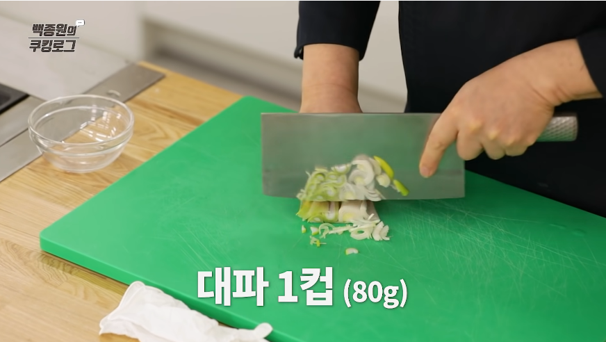 대파는 반으로 갈라 송송 썰어 준비한다.