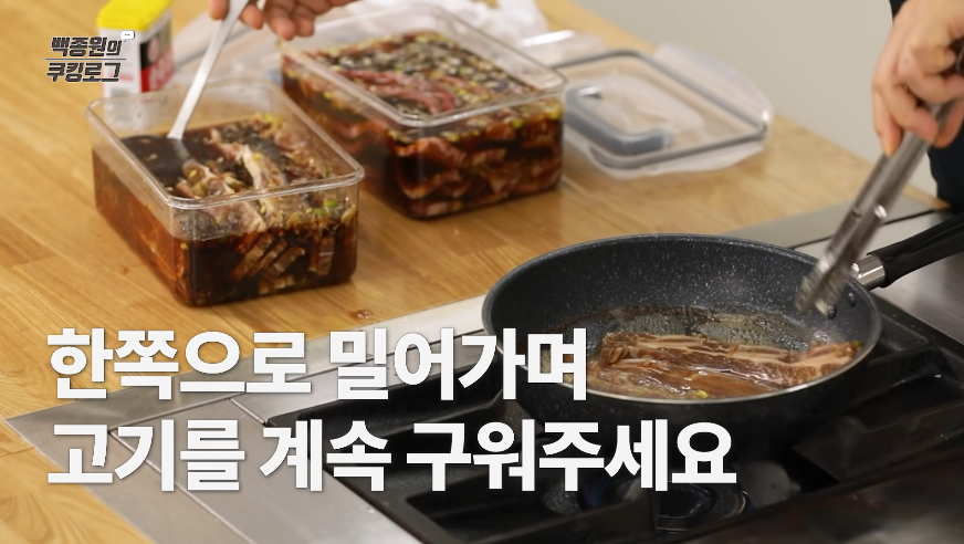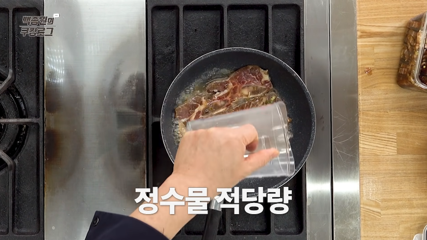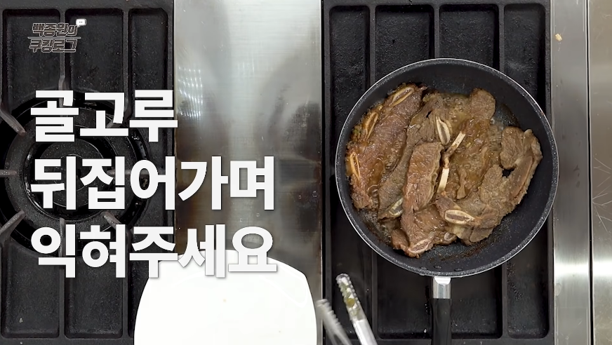 프라이팬에 재워 둔 갈비를 올리고 양념장, 물을 부어 졸이듯이 구워준다.