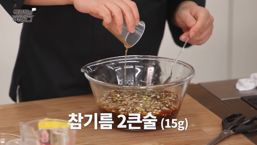 양념장의 설탕이 다 녹으면 참기름을 넣어 섞어준다.