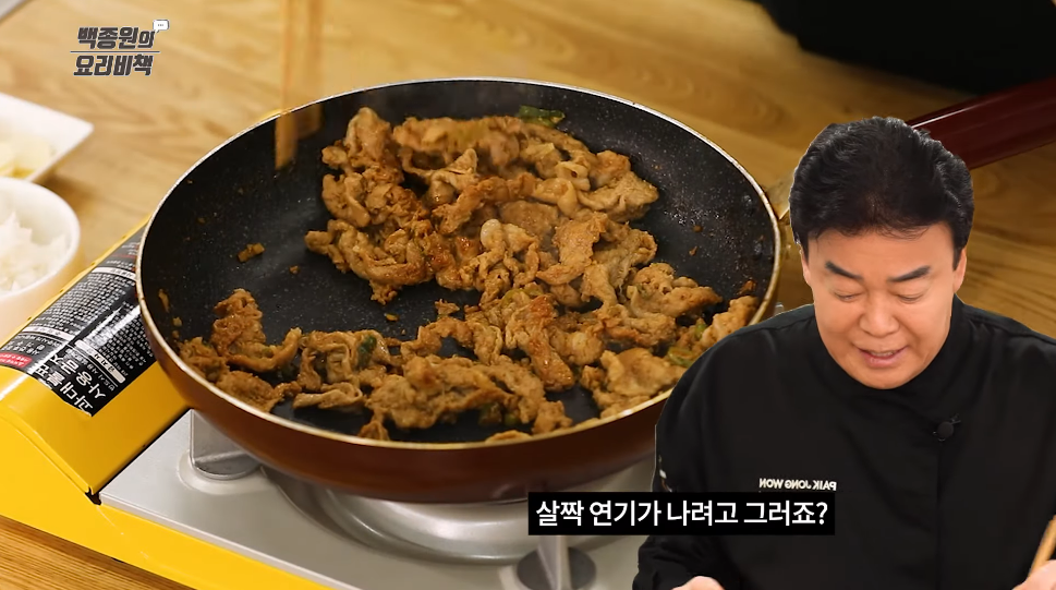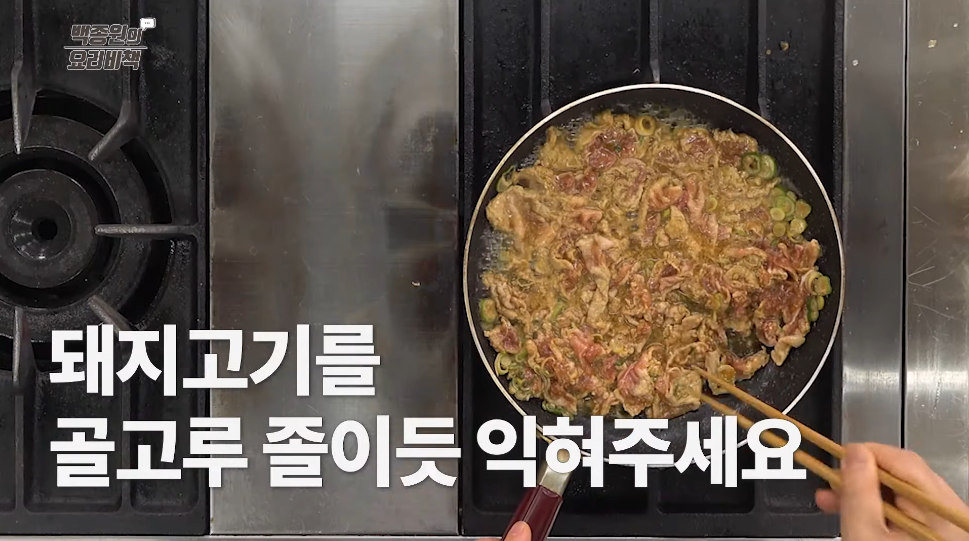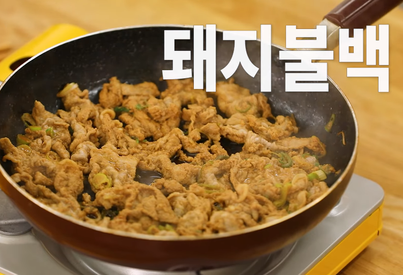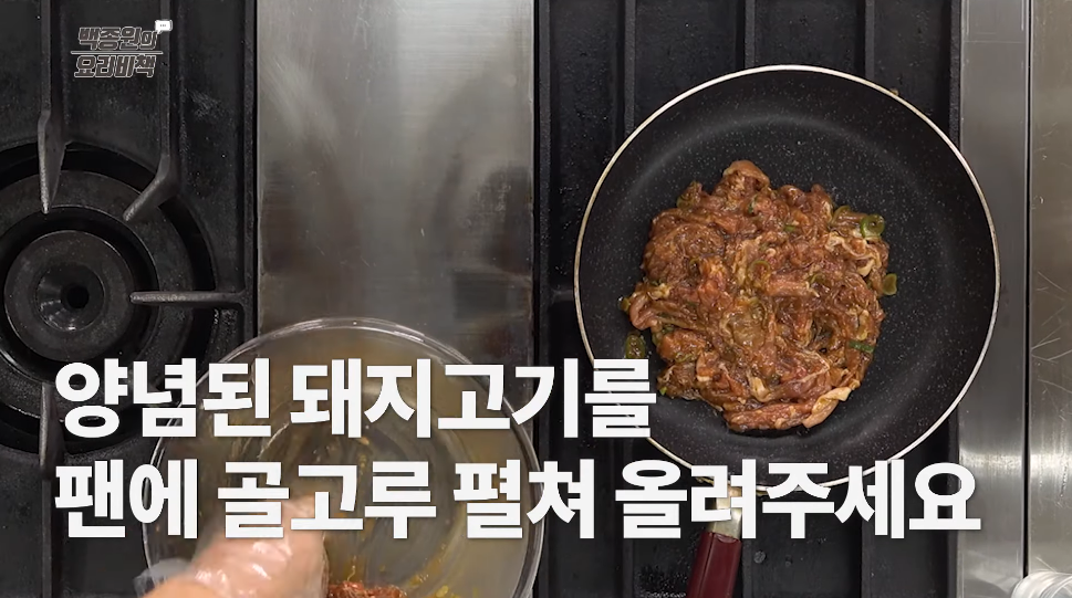 프라이팬을 강 불에 올린 후 양념 된 돼지고기를 올린다.