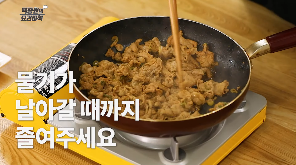 고기가 익으면서 양념이 눌어붙기 시작하면 물을 넣어 강 불에 졸여가며 익힌다.