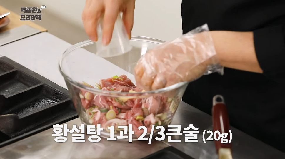 깊은 볼에 핏물을 살짝 제거한 돼지고기 후지, 대파, 간 마늘, 황설탕을 넣고 골고루 섞는다.