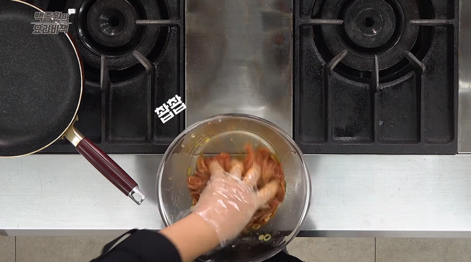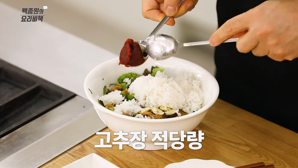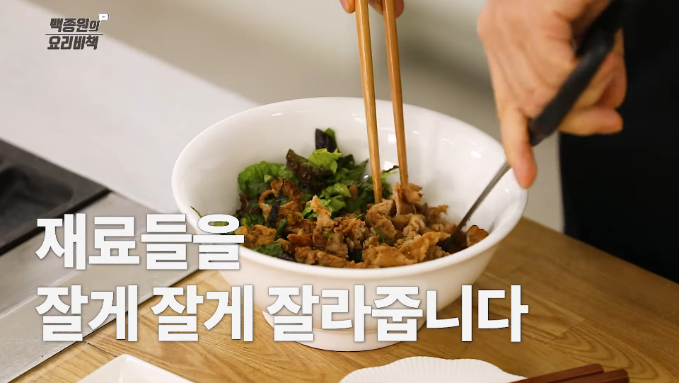 돼지불고기를 잘게 잘라 넣고 고추장, 참기름을 넣고 골고루 비벼서 완성한다.