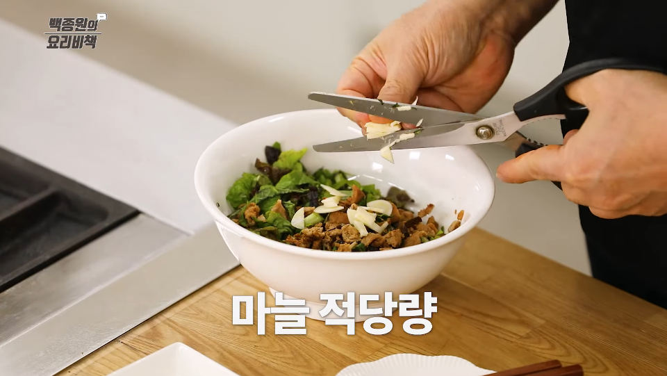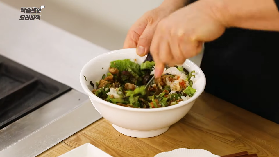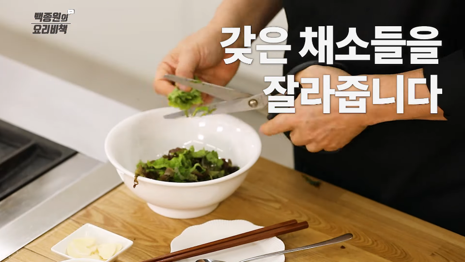 깊은 그릇에 밥을 담고 쌈채소를 가위로 잘게 잘라 넣는다.