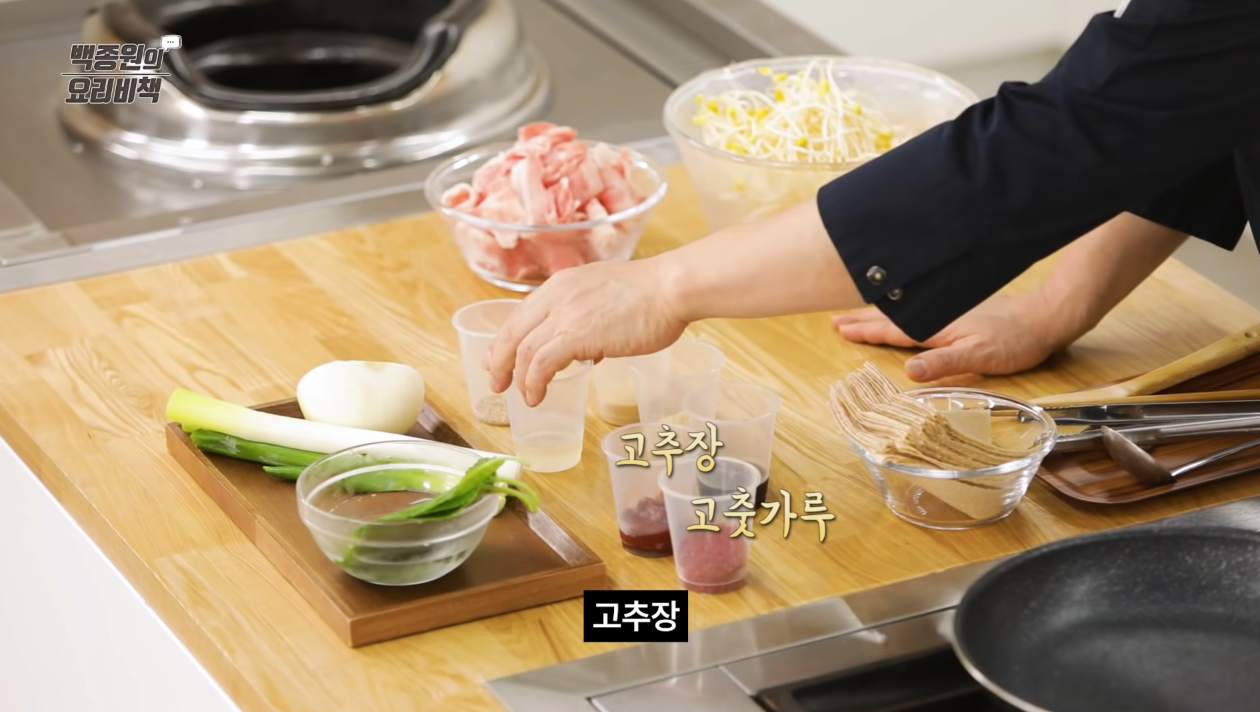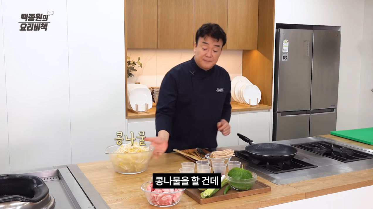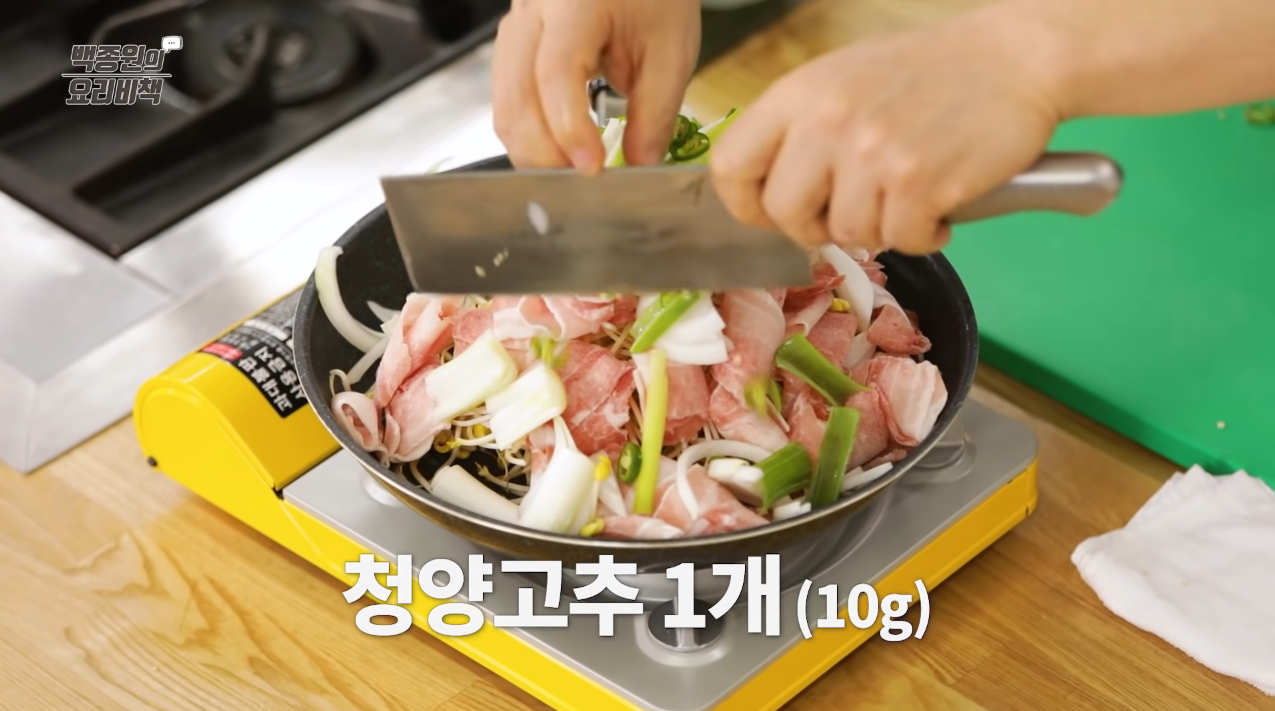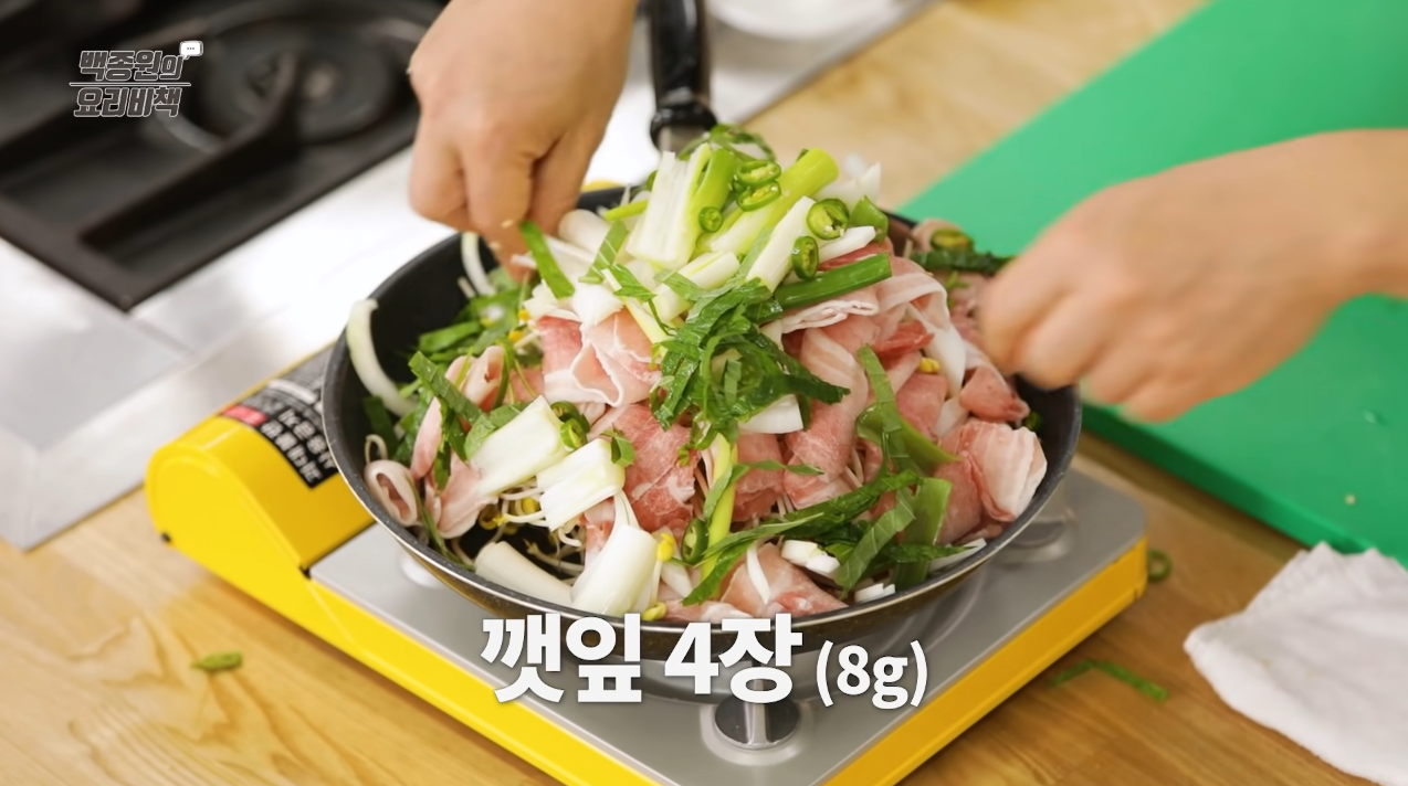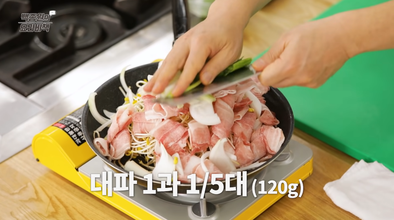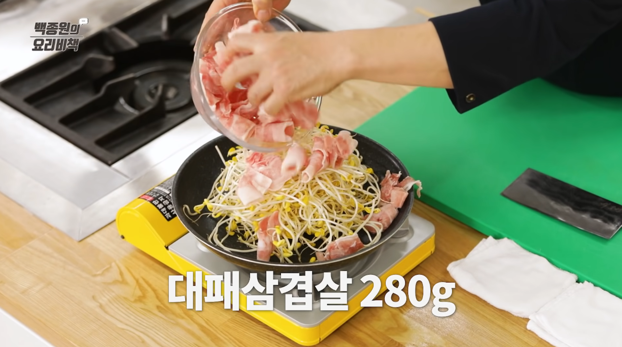 넓고 낮은 프라이팬에 콩나물을 깔고 그 위에 대패 삼겹살을 올린다.