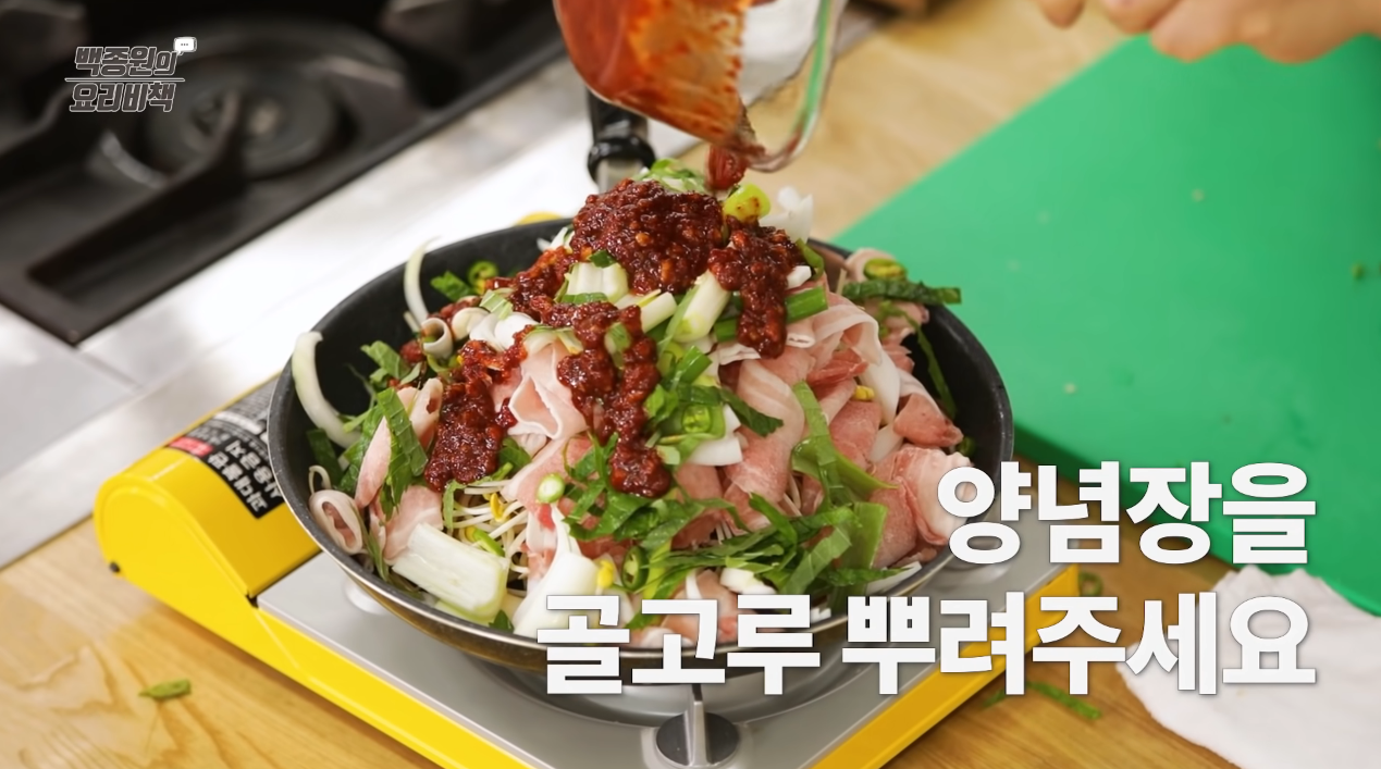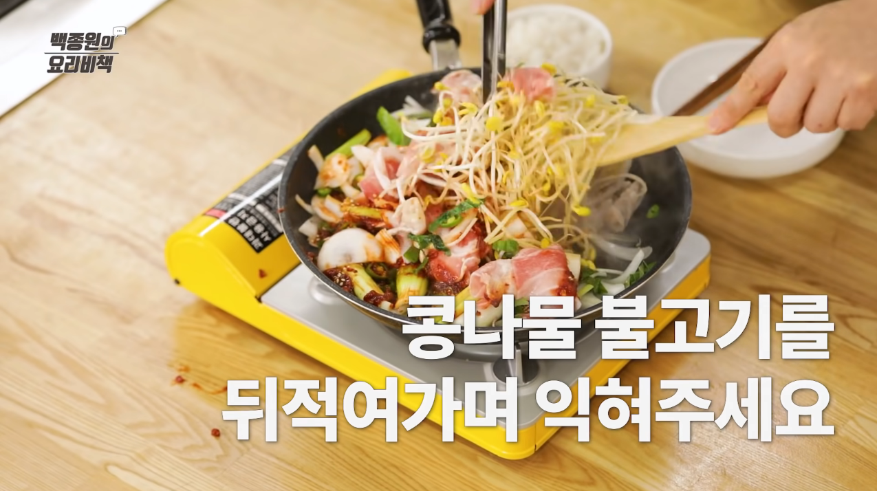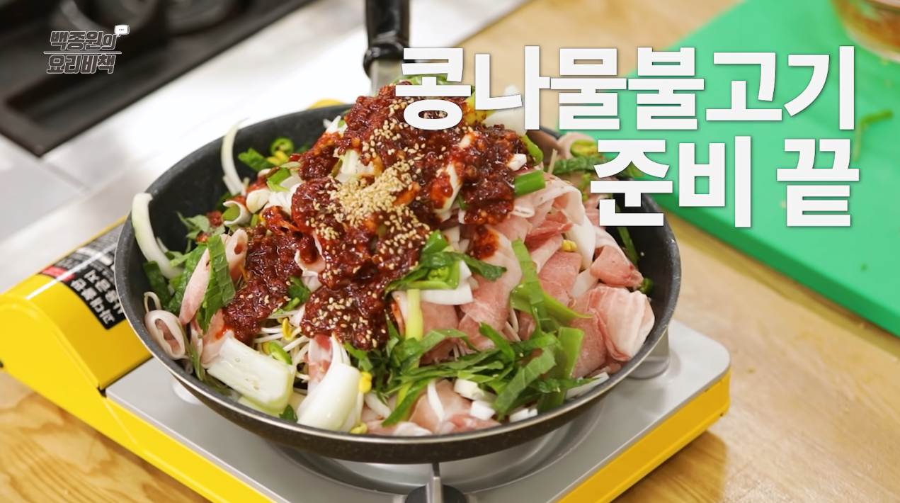 완성된 콩나물 불고기를 가스버너에 올려 중 불에 수분이 나올 때까지 기다린다.