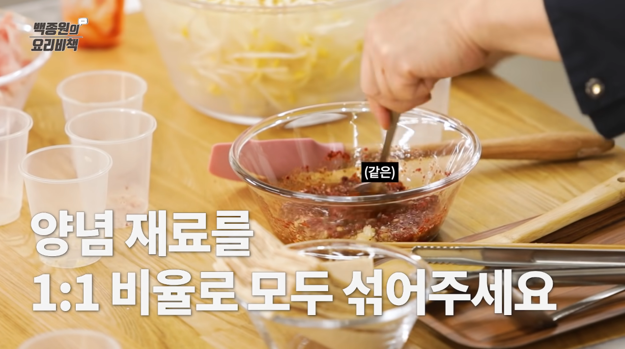 볼을 준비한 후 진간장, 맛술, 황설탕, 굵은 고춧가루, 고추장, 간마늘을 섞어 양념장을 만든다.