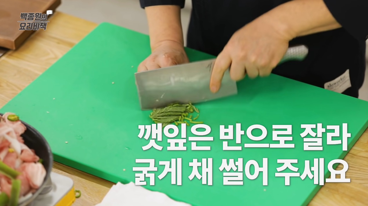 청양고추는 송송 썰고 깻잎은 세로로 반 자른 후 두께 1cm 정도로 채썰어 뭉쳐진 것을 풀어서 준비한다.