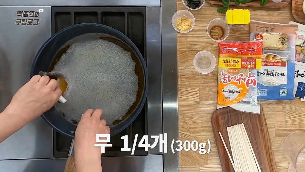 육수가 끓으면 중불로 줄여 무가 익을 정도 까지 끓인다.