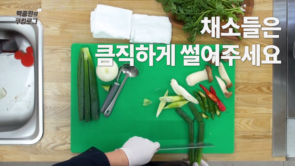 홍고추, 풋고추, 청양고추, 대파는 큼직하게 어슷썰기 한다.