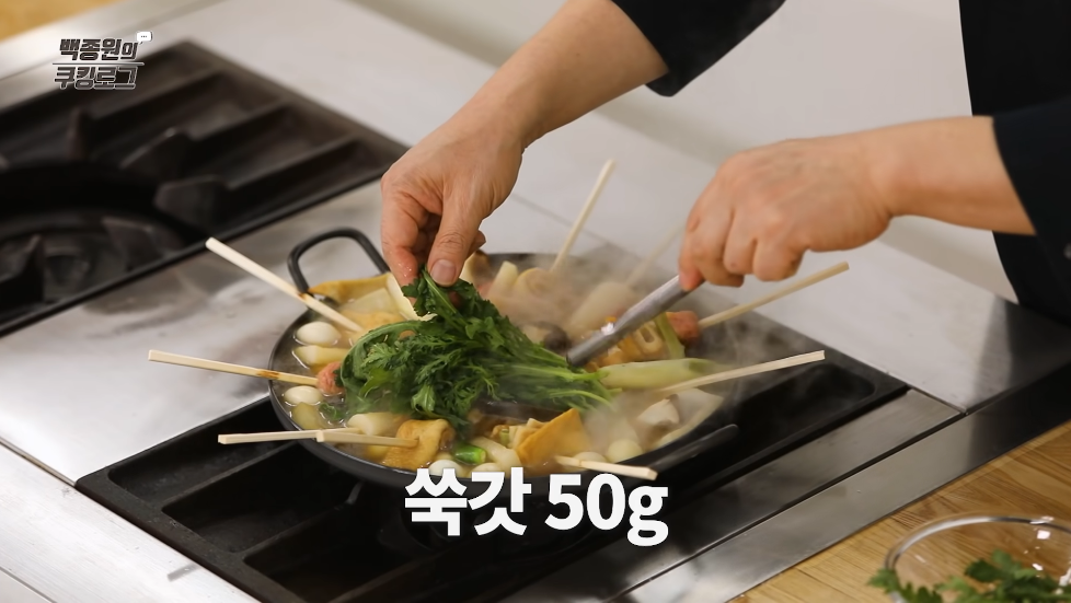 어묵이 익으면 쑥갓을 올려 마무리한다.
