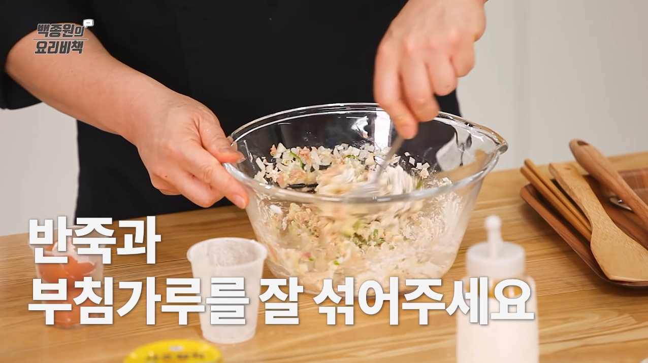 반죽에 부침가루를 넣어 골고루 섞는다.