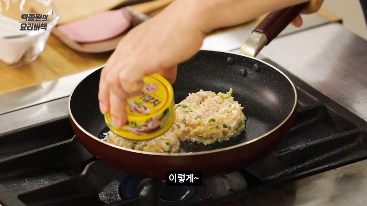 빈 참치캔에 반죽을 가득 평평하게 담아 예열 된 프라이팬에 엎어 모양을 잡고 약 불로 줄여 골고루 튀기듯이 익힌다.