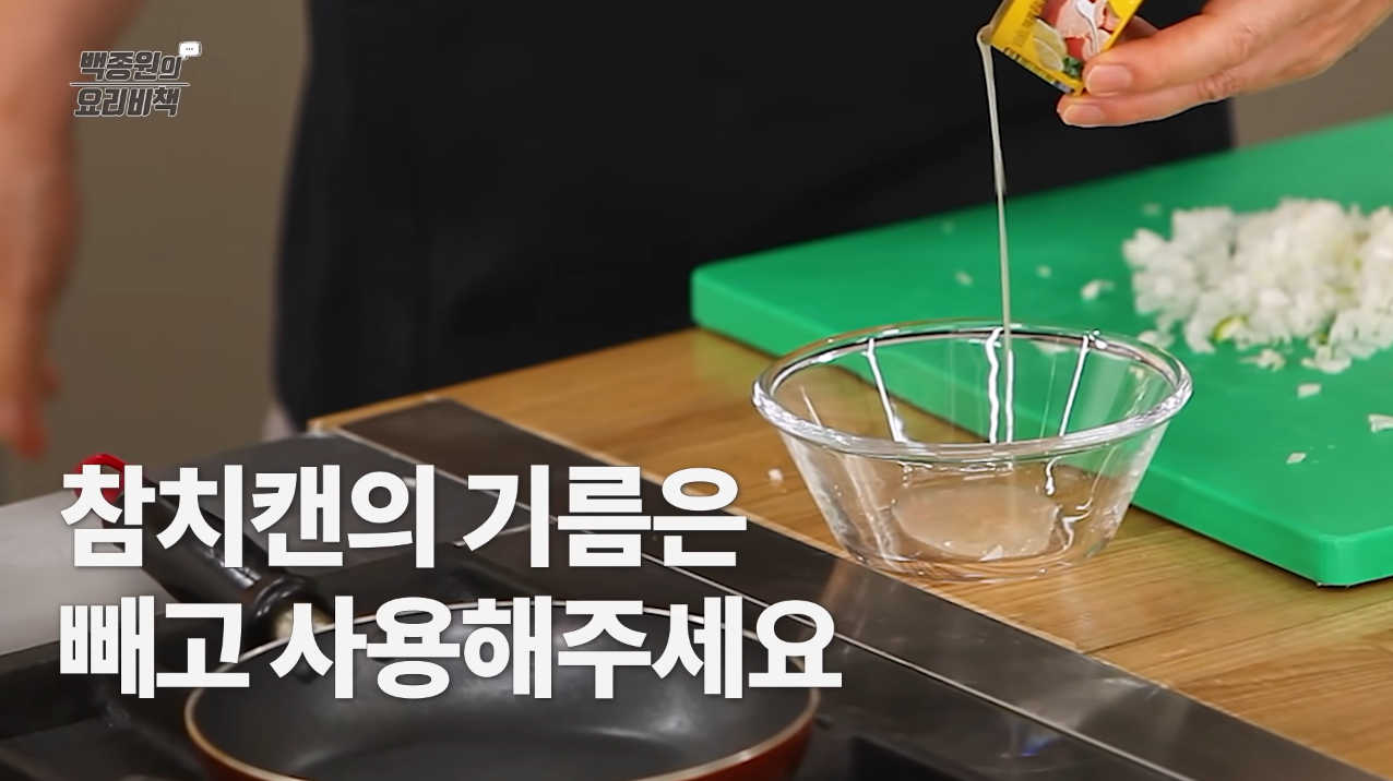 참치는 기름을 따라내고 살코기만 준비한다.
