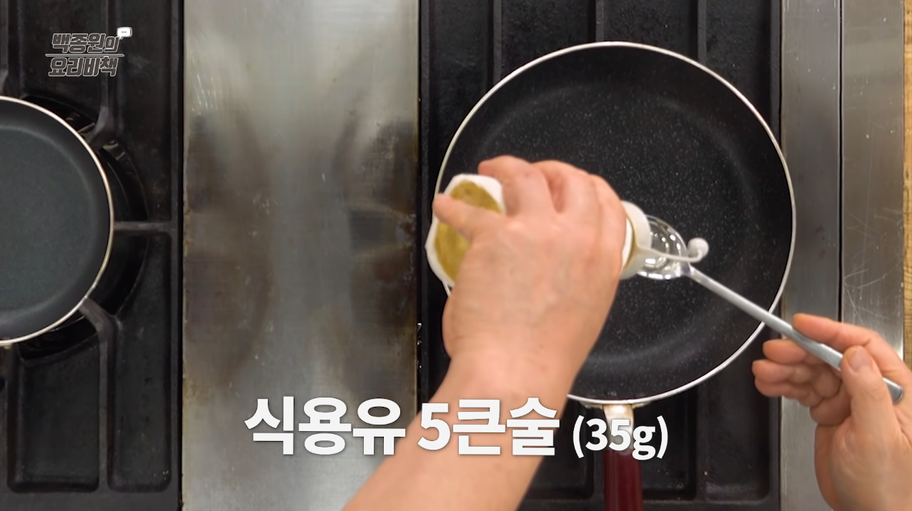 프라이팬에 식용유를 두르고 강 불에 예열한다.
