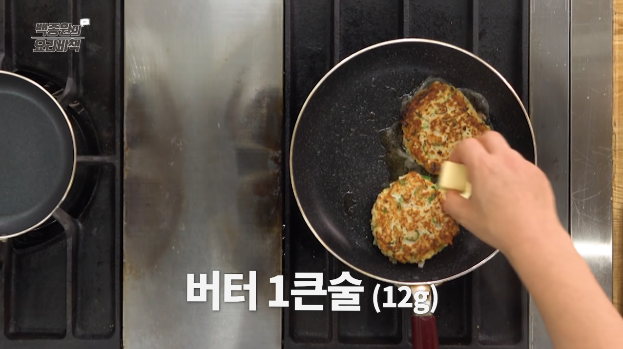 참치 함박 스테이크의 양면이 노릇해지면 버터를 넣고 프라이팬을 돌려가며 버터향을 골고루 입힌다.