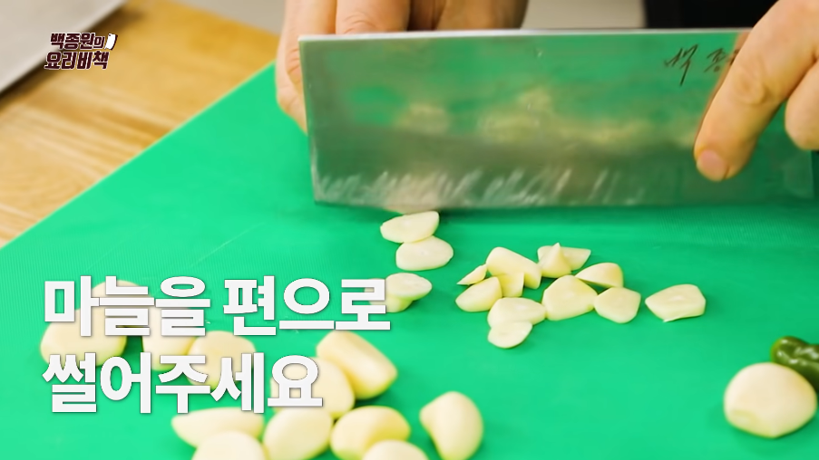 통마늘은 꼭지를 제거하고 두께 0.3cm 로 편 썬다.
