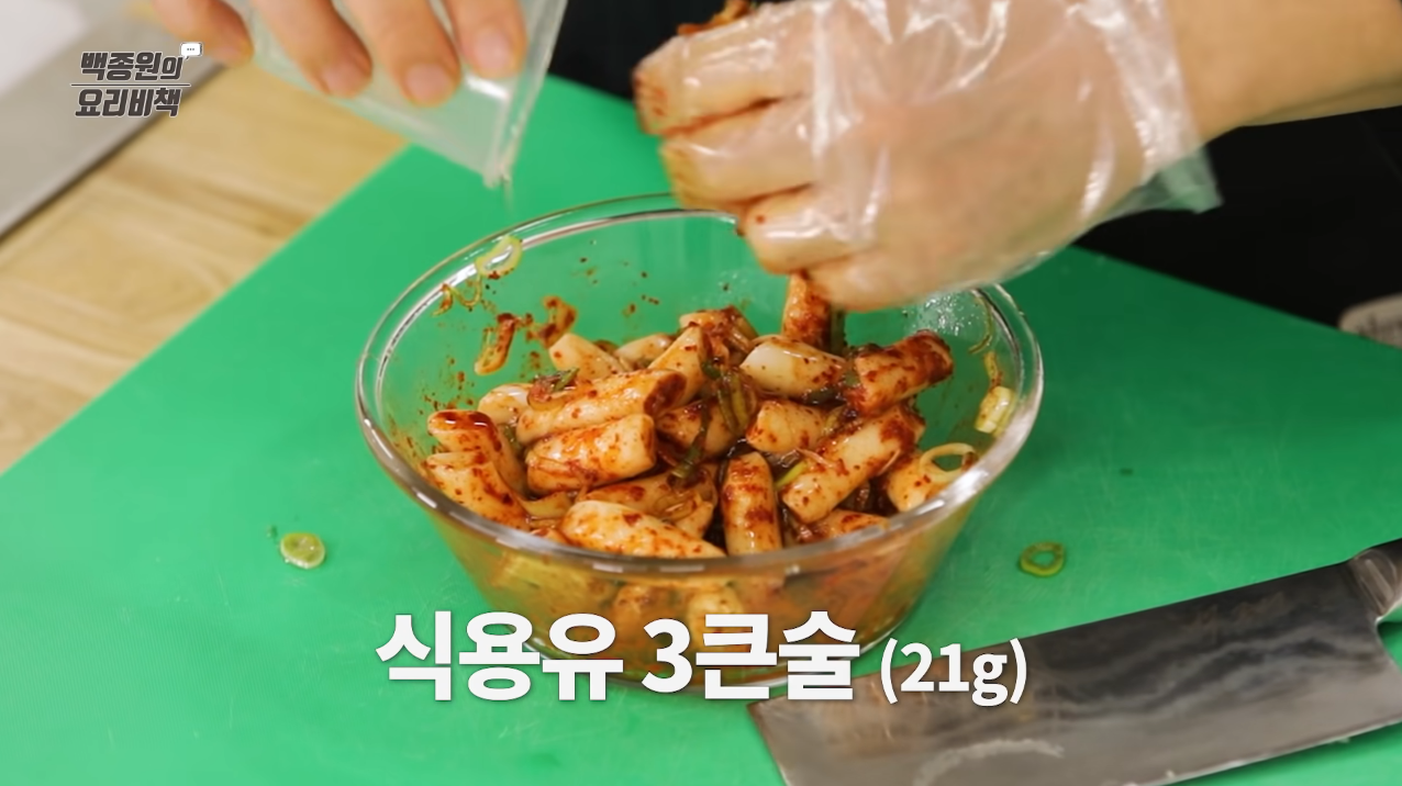 떡볶이에 색이 나면 식용유를 넣고 버무린다.