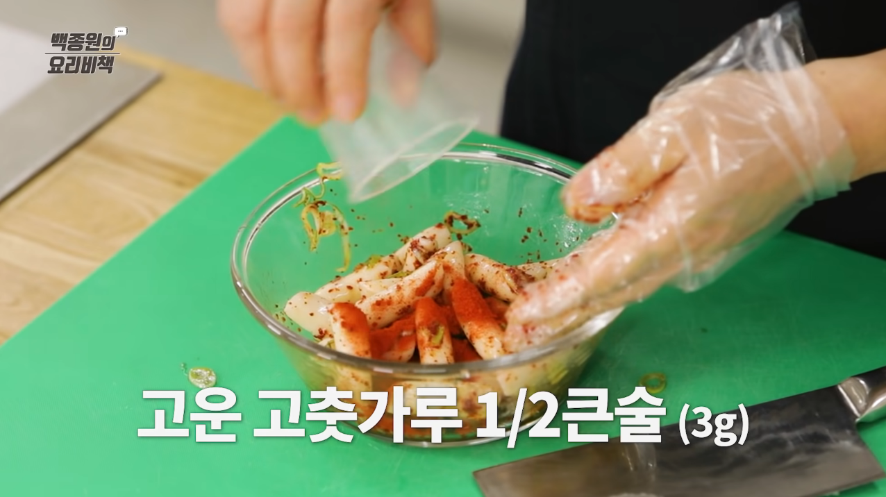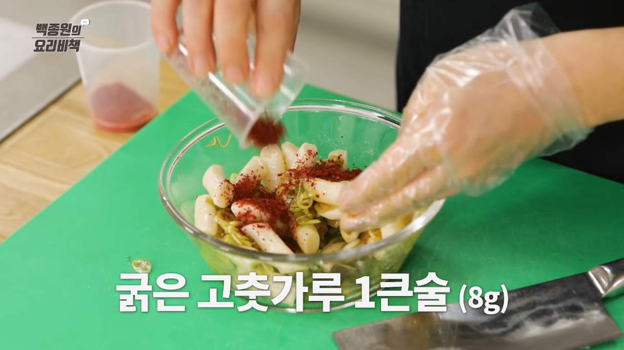 양념과 골고루 섞인 떡볶이에 굵은 고춧가루, 고운고춧가루를 넣어 골고루 버무린다.