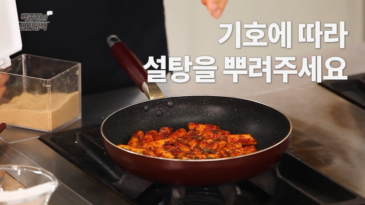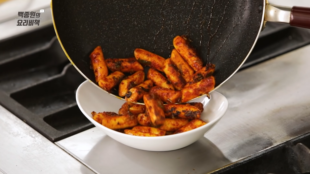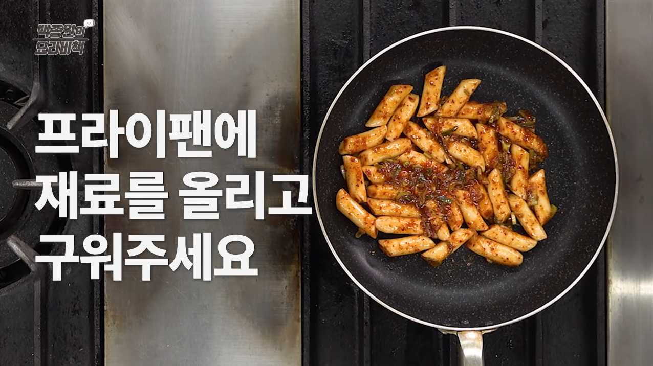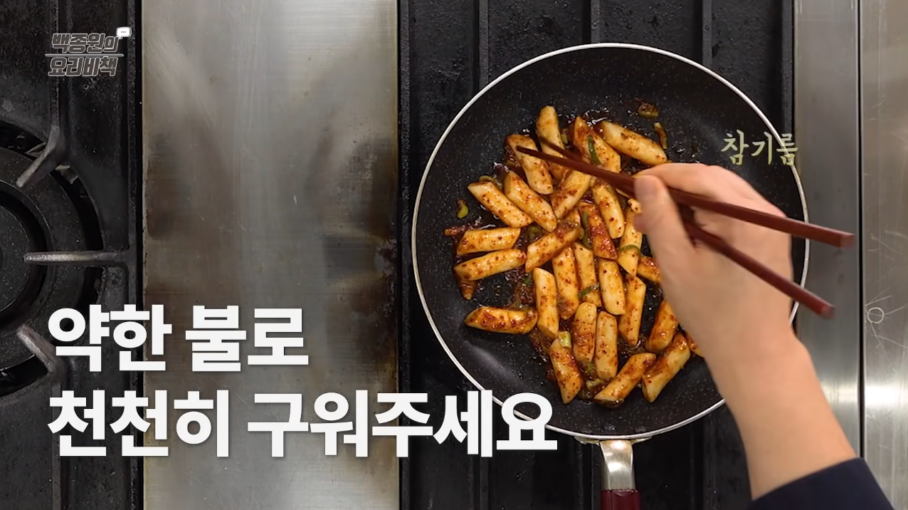 떡볶이가 타지 않게 떡을 굴려가며 바짝 굽는다.