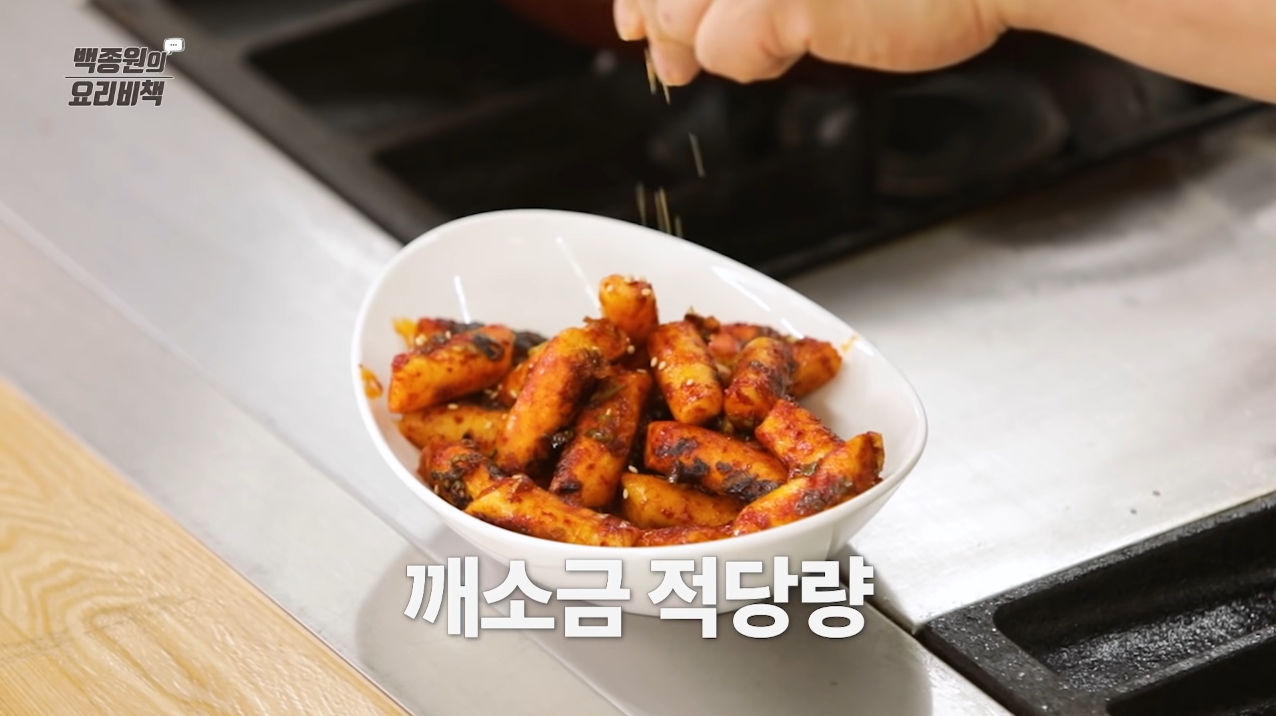 떡볶이를 접시에 담고 깨소금을 뿌려 완성한다.
